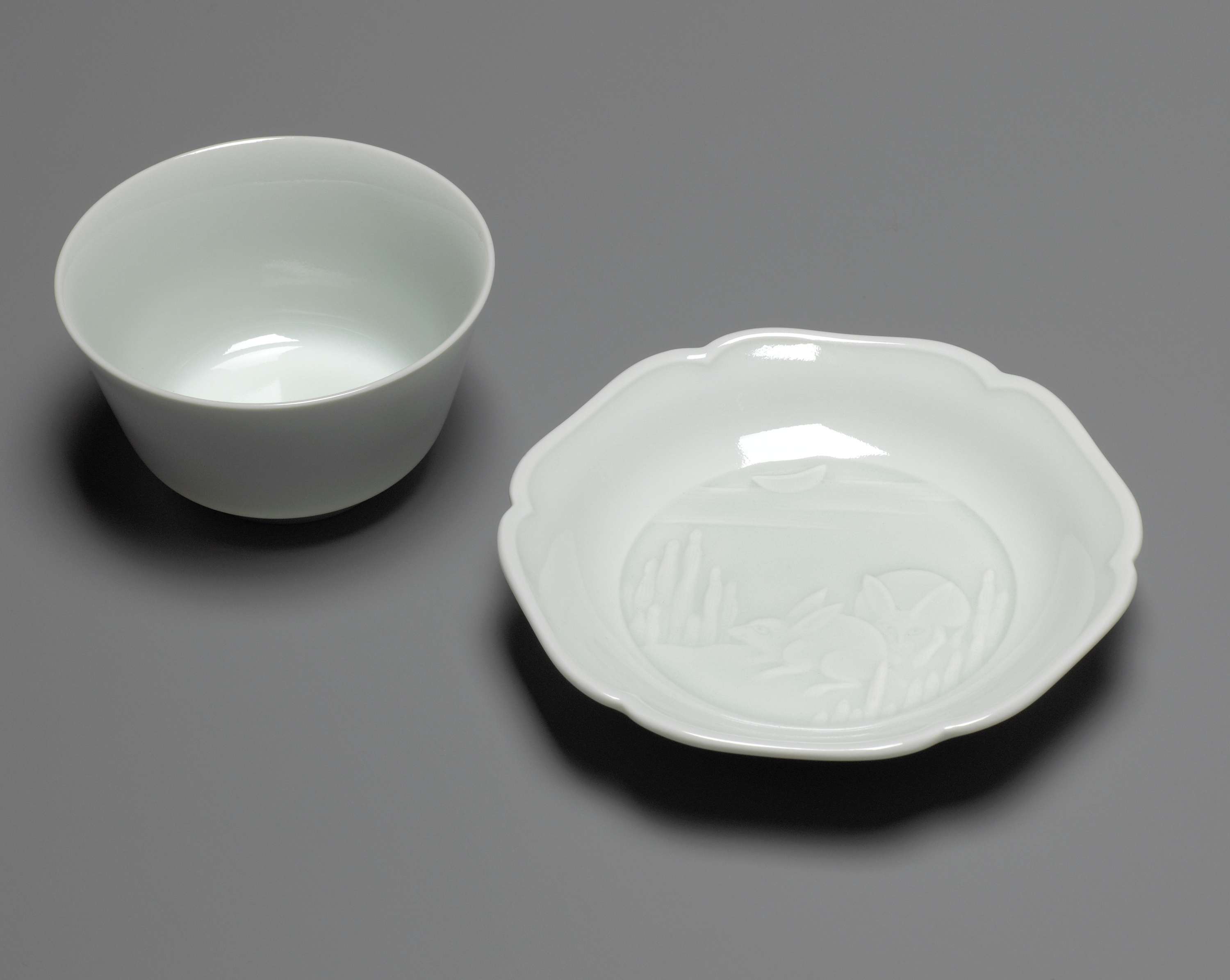 Klokvormige kop en een geschulpte schotel van porselein, bedekt met een celadongroen glazuur. Op het plat van de schotel in reliëf twee hazen in een landschap onder de maan tussen wolken. Op de bodem van de kop alleen de maan tussen wolken. Gemerkt op de onderzijde. Monochromen. (Nederlands)
