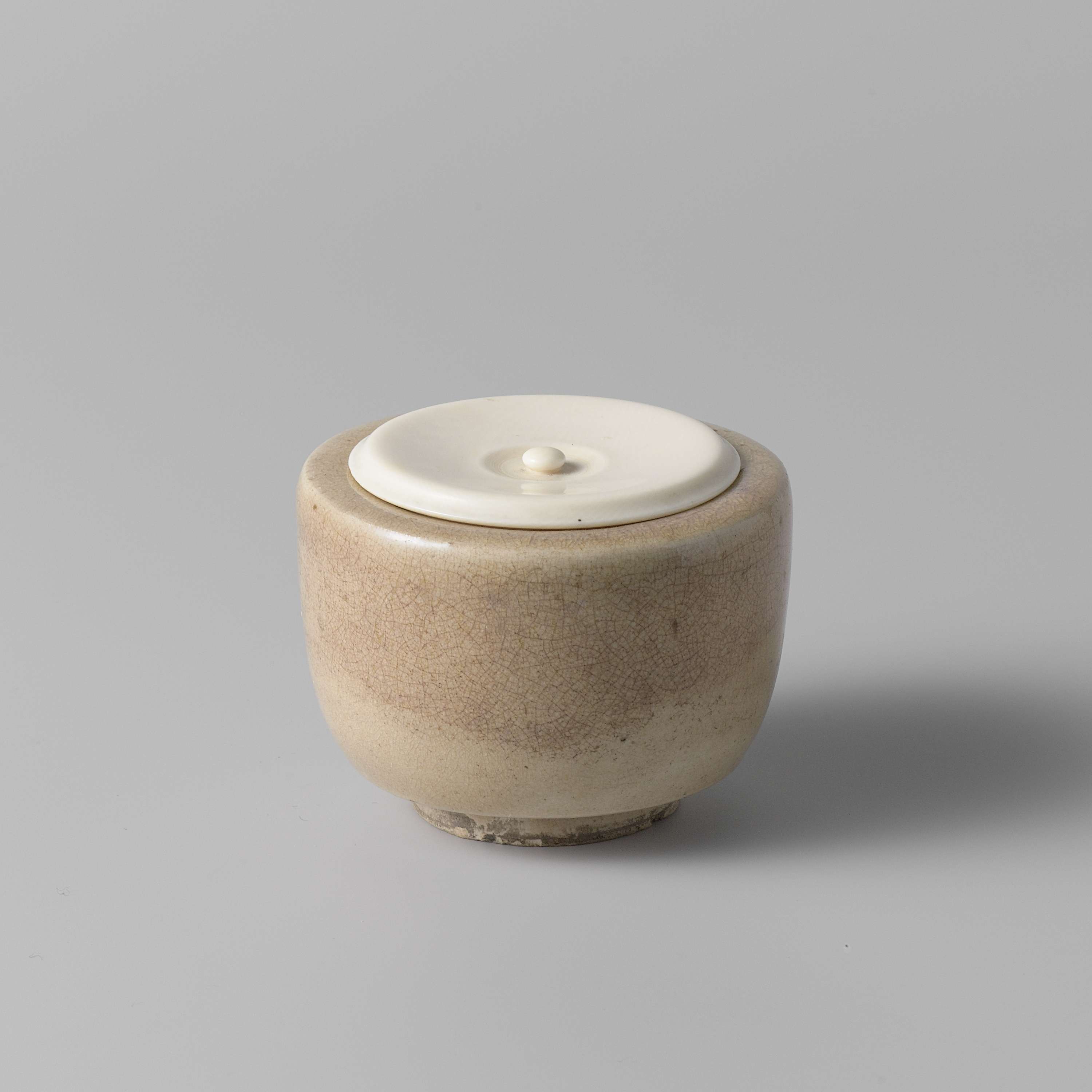 Theebus van steengoed met een plat deksel van ivoor, bedekt met een wit slib. (Nederlands)
