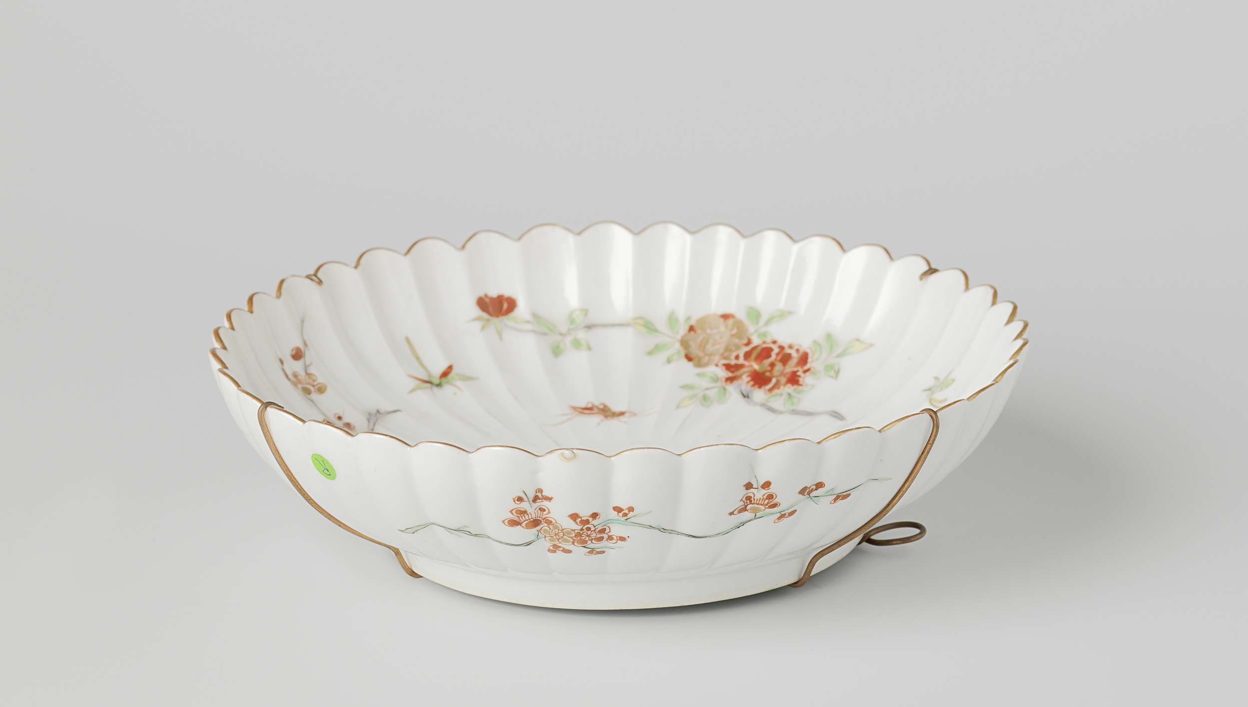 Schaal van porselein met geribde wand en gelobde rand, beschilderd op het glazuur in rood, groen, geel, aubergine, zwart en goud. Op het plat een pioentak. De wand met twee pioentakken en een prunustak; tussen de takken vliegende insecten. De achterzijde met drie prunustakken. De schaal is gevat in een metalen montuur. Overgedecoreerd (Amsterdams bont). (Nederlands)