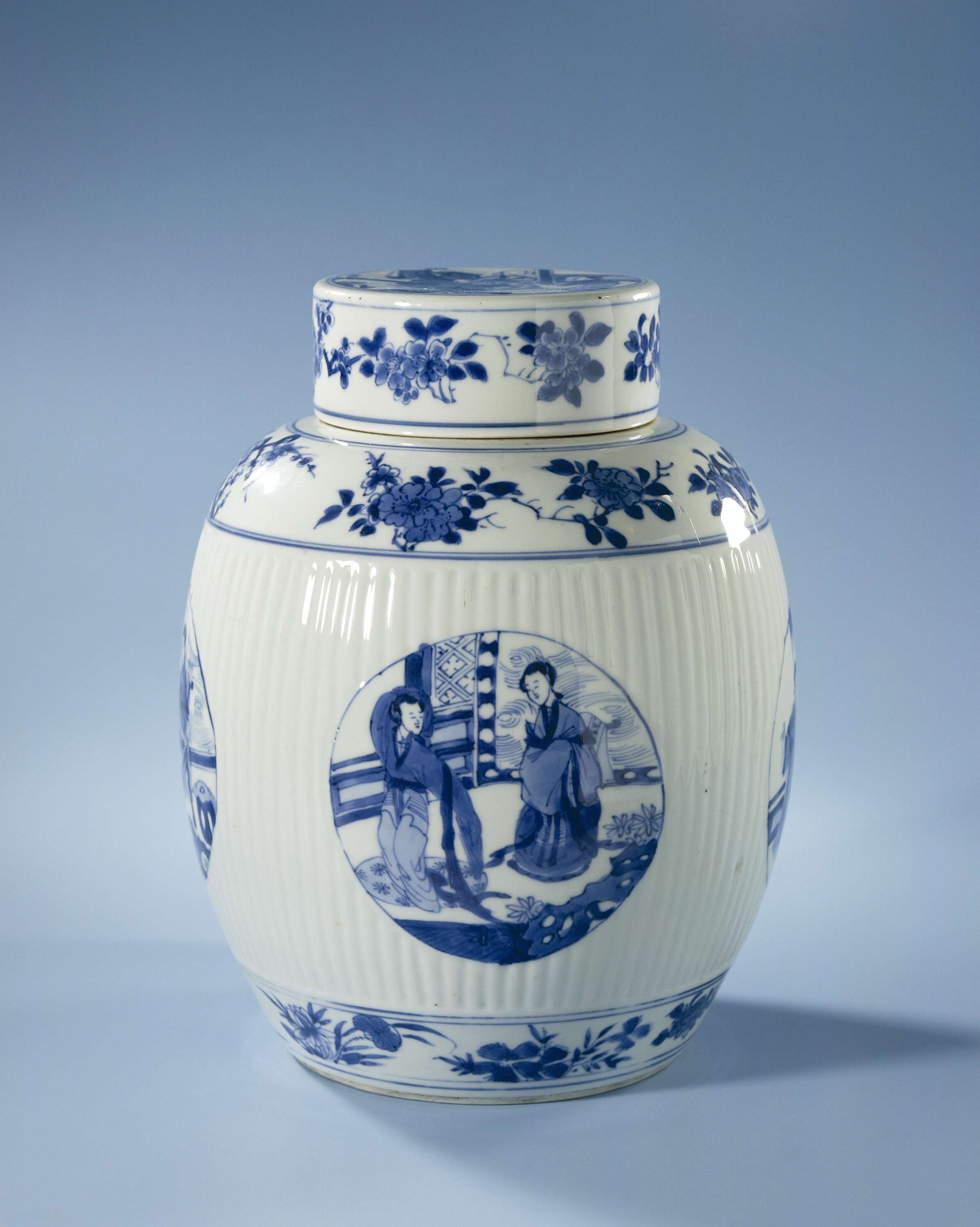 Eivormige pot op voetring, met geribd wand en wijde cilindrische deksel op een korte ongeglazuurde hals. Gedecoreerd in onderglazuur blauw met vier medaillons; één met twee dames in een omheinde tuin: één met twee dames die 'go' spelen; één met twee dames en een danser in een interieur; één met twee dames en een bediende bij een tafel in een omheinde tuin. Rondom de schouders, voet en deksel banden met bloem- en fruitranken. Op de deksel drie geleerden met een bediende die een kopje aanbiedt in een interieur. Op de bodem het zes-karaktermerk Chenghua. (Nederlands) | |||||||||||||||||||