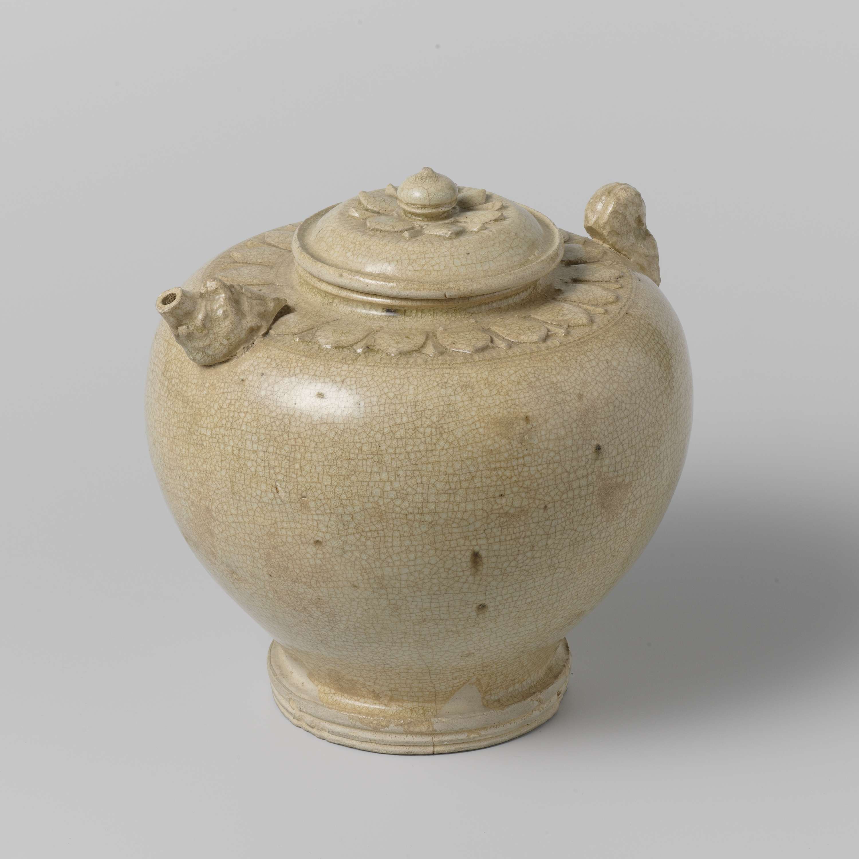 Vaas met tuit, handvat en deksel, crème gecraqueleerd glazuur. (Nederlands)