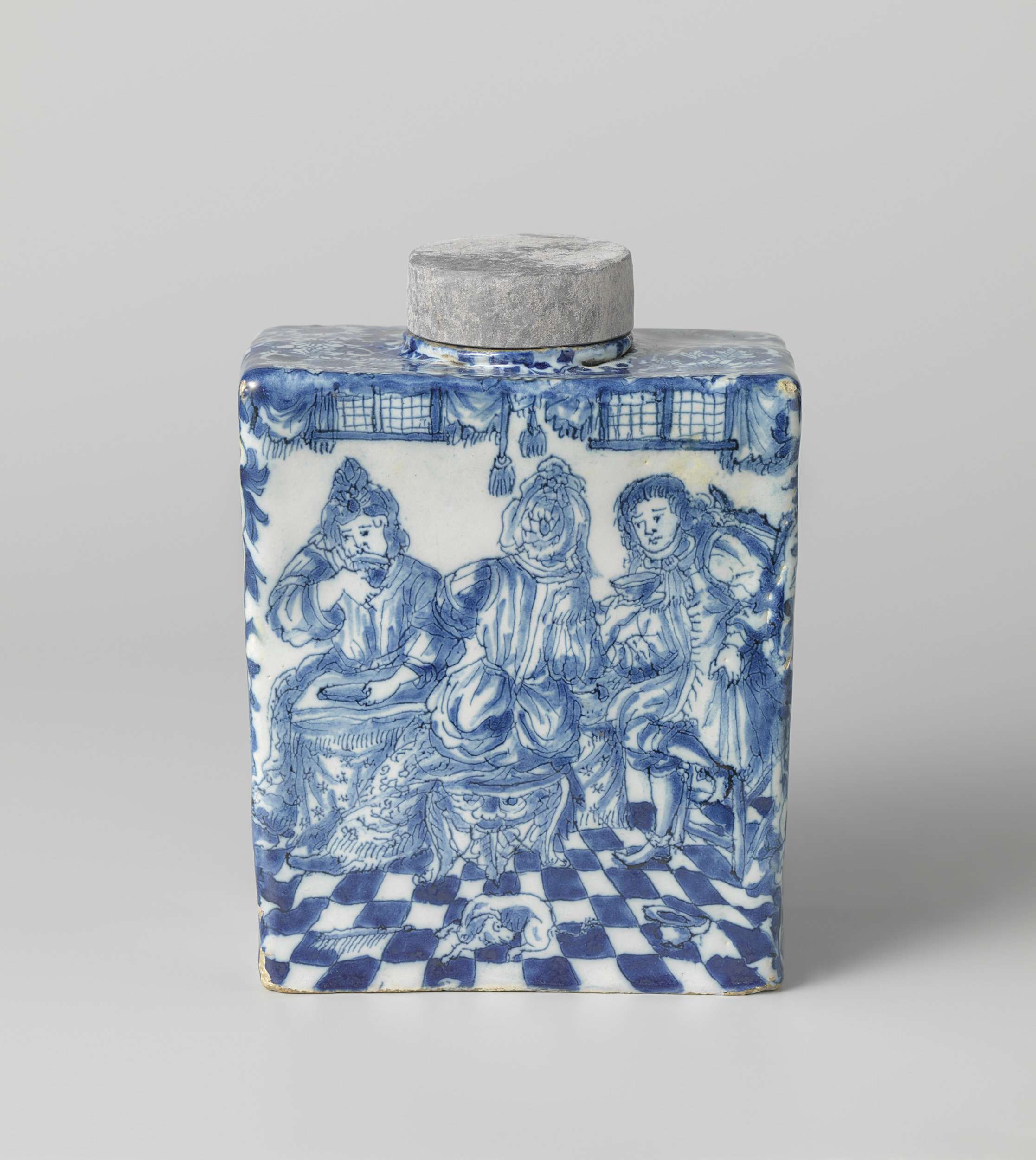 Theebus met kraambezoek, langs de hals een schroefdraad. De dop is later toegevoegd. (Nederlands)