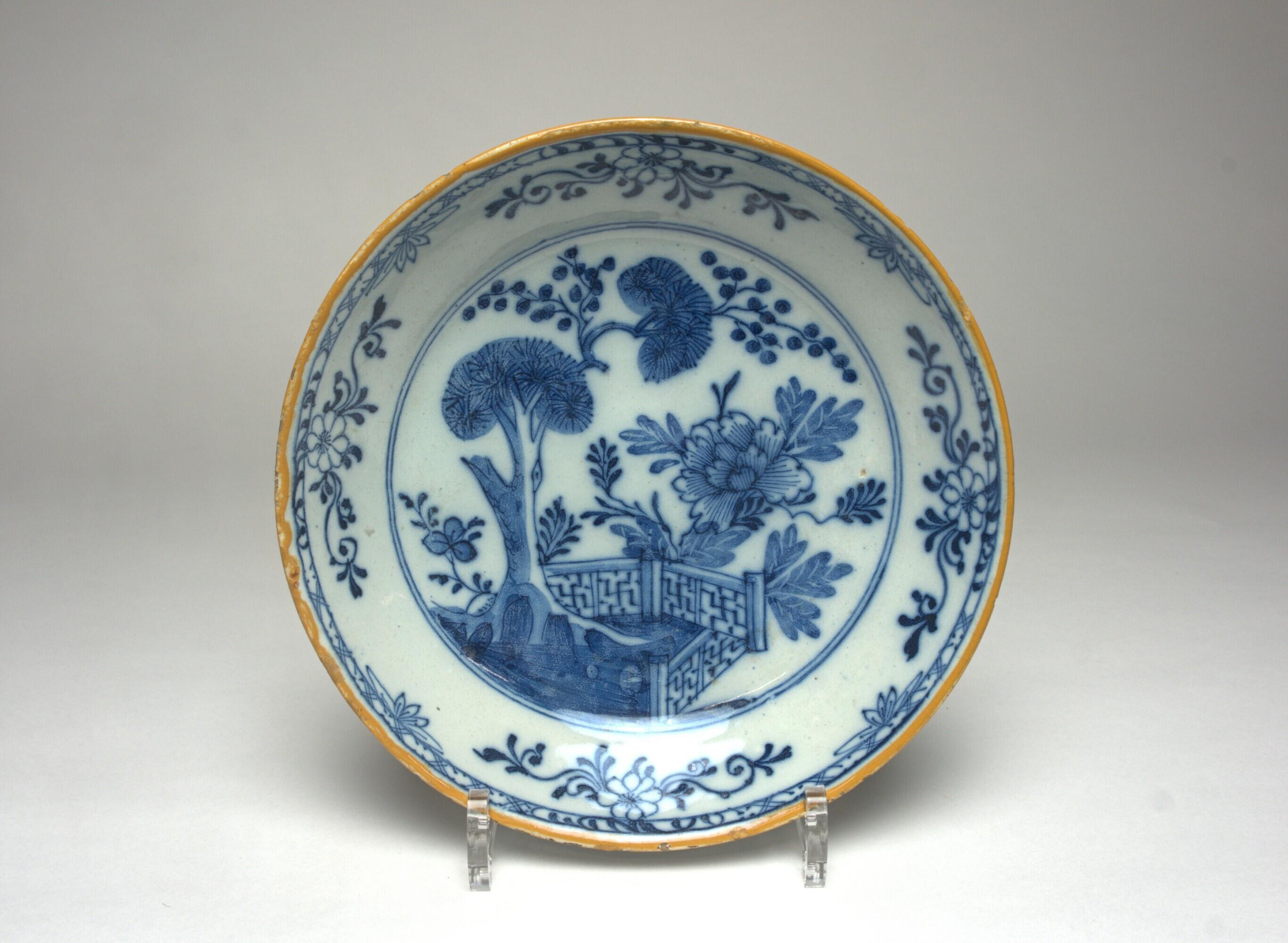 Diep bord met voorstelling van Chinese tuin met boom, hekwerk en bloeiende pioenroos, omsloten door dubbele ring, ornamenten op rand bestaande uit bladerrankjes, met okergele rand. (Nederlands) | |||||||||||||||