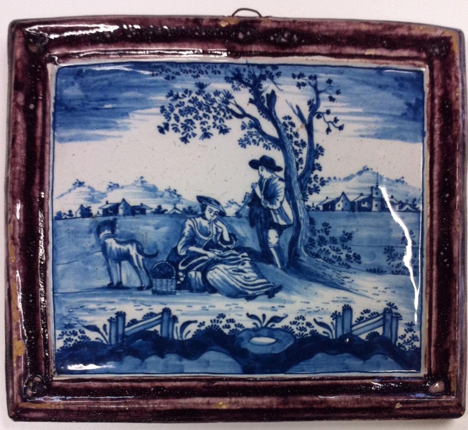 Plaque met een meegebakken lijst in mangaan en een onderglazuur blauw decor van een herder en een herderin. Hij speelt een blaasinstrument voor haar. De hond kijkt naar de stad of het dorp in de achtergrond. (Nederlands)