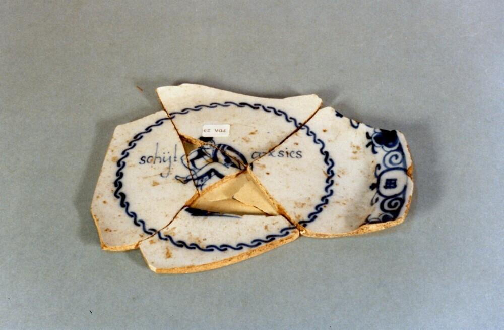 eigenschap / beschrijving: Fragment van bord met opschrift 'schijt axsies'. Tussen de woorden 'schijt' en 'axsies' bevindt zich een half hurkende man met geheven been, die zich van zijn ontlasting ontdoet. Tussen beide benen houdt hij een papier waarop het cijfer 51. Het geheel is door een krans van golvende lijntjes omgeven. De rand van het bord heeft gestileerde vegetatieve ornamenten. (Nederlands) / bron