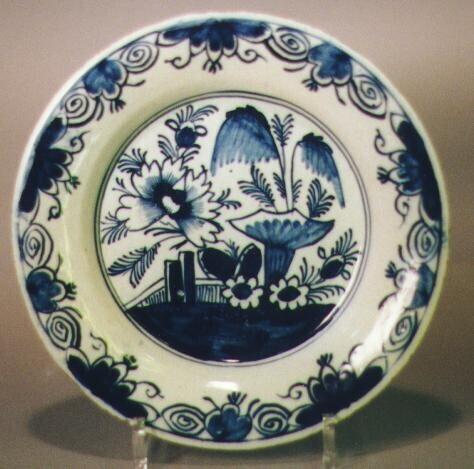 eigenschap / beschrijving: met bloeiende Chinese tuin, rond, op het plat tuin met hekwerk, links een grote bloem, rechts een paddenstoelvormige vaas waarin plant met twee buitenwaarts gebogen takken met lange smalle bladeren, de grond is blauw ingekleurd, tegen de rand een concentrische ring versiert met aaneengesloten reeks halfzichtige vierbladige ornamenten, afgewisseld door soortgelijk kleiner ornament met aan weerszijden krulwerk, grove navolging Chinees porselein. Faience. Floralistisch en ornamentaal decor in blauw onderglazuur. Grove nabootsing van Chinees decor. (Nederlands) / bron