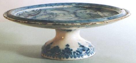 eigenschap / beschrijving: Tazza, presenteerschaal, met geprofileerde rand, rustend op holle, koepelvormige voet met brede stam. Op het plat de verleiding van Jozef door vrouw van Potifar (Gen. 39: 1-23) in architectonische setting; geprofileerde, 'gemarmerde' cirkelband; op voet band van bloemen; onderzijde zes Chinese gelukstekens met linten (Nederlands) / bron