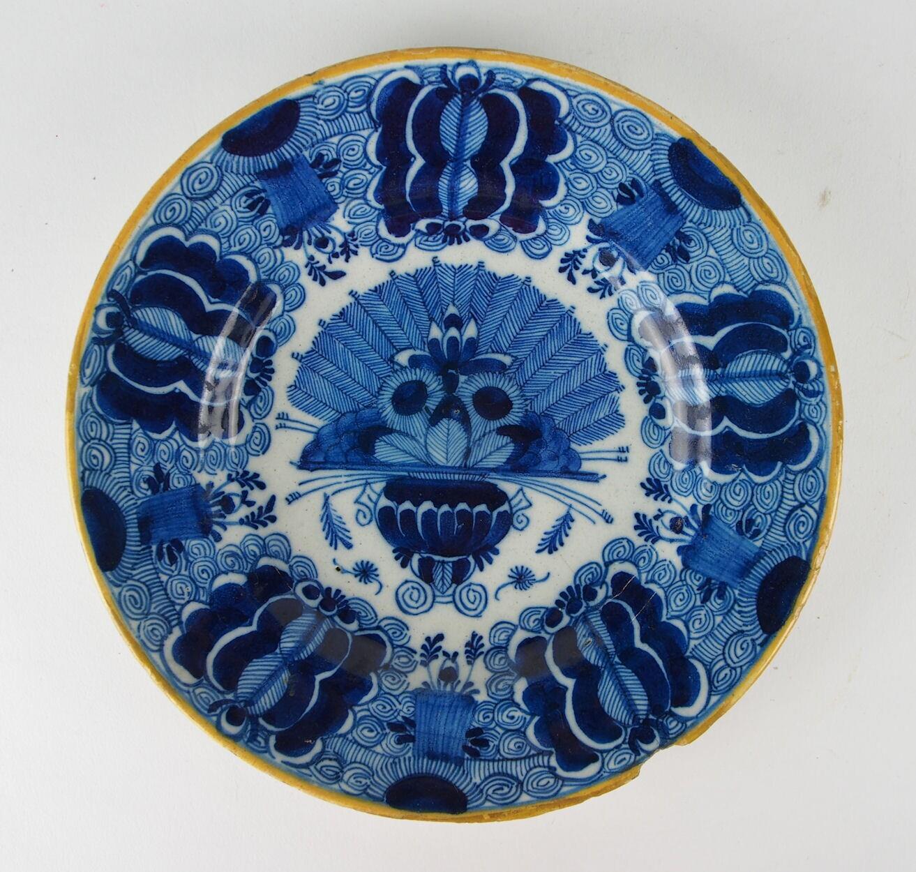 De randdecoratie van dit bord bestaat uit een soort vlinderornament alternerend met een halve bloem. De tussenliggende vlakken tonen het spiraalmotief. De centrale voorstelling in het plat vertoont een vaas gevuld met een waaiervormig boeket van varens en zonnenbloemen. Dit patroon staat bekend als waaier- of pauwenverendecor. Dit decor is veelvuldig toegepast op blauwwit en polychroom platgoed van De Porceleyne Bijl en De Lampetkan. (Nederlands)