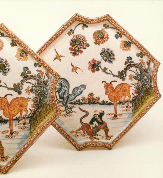 | eigenschap / beschrijving: Ruitvormige plaque met ingeschulpte hoeken. De voorkant is gedecoreerd met een oosterse man in gevecht met een tijgerachtig dier. In de achtergrond twee fabelachtige dieren en bloeiende struiken. De decoratie bevat een aantal elementen die zijn ontleend aan het Japanse Kakiemon porselein. De tijger is een veel voorkomend element op Kakiemon porselein, alleen nooit in gevecht met een figuur, zoals op deze plaquettes. De geordende compositie en de rechte en duidelijke horizon is typisch Europees. (Nederlands) / rang | |||||||||||||||||||