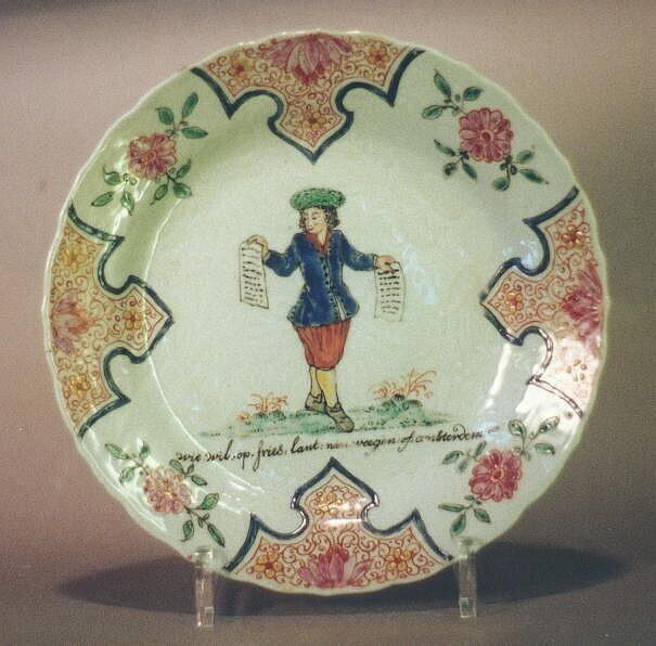 rond, gegolfde rand, standring, licht reliëfpatroon van bloemen en ranken onder het glazuur, op de rand vier evenredig verdeelde wolkenmotieven, afgewisseld met floraal ornament, op het plat een half naar rechts gewende staande man met groene bontmuts, blauwe jas en roodbruine pofbroek, in beide handen houdt hij een aandeel, onderschrift: 'wie:wil:op:fries:lant:ninweegen:of:amsterdam' (Nederlands) | |||||||||||||||