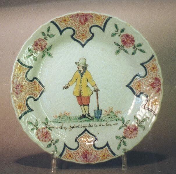 rond, gegolfde rand, standring, licht reliëfpatroon van bloemen en ranken onder het glazuur, op de rand vier evenredig verdeelde wolkenmotieven, afgewisseld met floraal ornament, op het plat een naar links kijkende man met groene hoed, gele jas en oranjerode pofbroek, in zijn linkerhand houdt hij een spade, met zijn rechterhand wijst hij omlaag, onderschrift: 'wie:wil:op:Uijtert:om:See:te:Stecken' (Nederlands)