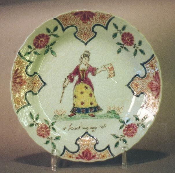 rond, gegolfde rand, standring, licht reliëfpatroon van bloemen en ranken onder het glazuur, op de rand vier evenredig verdeelde wolkenmotieven, afgewisseld met floraal ornament, op het plat een staande dame met fontange en gebloemde gele rok, in haar rechterhand houdt zij een stok, in haar linkerhand een aandeel waarop een huis is getekend, onderschrift: "Kinkanprooij" (= Quincampoix, de straat in Parijs waar John Law zijn kantoor had gevestigd) Vanwege de speculatiehandel moet de dame haar huis verkopen. De afbeeldingen op de Actiebordjes behoren tot de bekendste historische taferelen. Als gevolg van de speculatie met aandelen (acties) van zwendelmaatschappijen, werd in eerste instantie veel geld verdiend. Door de economische crisis in 1720 stortte de markt in waardoor velen tot armoede vervielen. Deze gebeurtenis werd tot onderwerp van veel spotprenten en schotschriften waarvan het bekendste is 'Het Groote Tafereel der Dwaasheid' uit 1720. (Nederlands) | |||||||||||||||