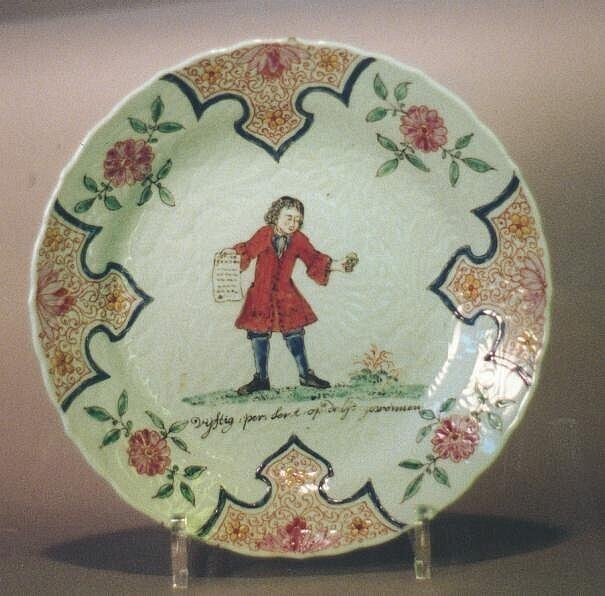| eigenschap / beschrijving: rond, gegolfde rand, standring, licht reliëfpatroon van bloemen en ranken onder het glazuur, op de rand vier evenredig verdeelde wolkenmotieven, afgewisseld met floraal ornament, op het plat een staande man gehuld in blauwe broek en rode jas op groen grondje, in zijn rechterhand houdt hij een vel papier (aandeel), onderschrift: "vijftig:per:sort:op:delft:gewonnen" (Nederlands) / rang | |||||||||||||||