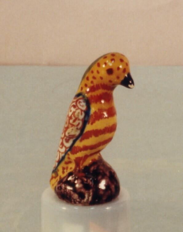 | eigenschap / beschrijving: Beeld van een vogel, van veelkleurig beschilderd faience, zittend op mangane bolle voet met marmertekening. De vogel heeft een roodbruin gespikkelde gele kop met blauwe snavel en roodbruin gestreepte gele borst. De vleugels zijn aangegeven met blauwe contourlijn en ingekleurd bruinrode spiralen. Een groene streek loopt over kop en rug. (Nederlands) / rang | |||||||||||||||