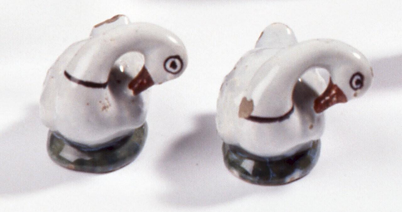 | eigenschap / beschrijving: Beeldje van een zwaan, de kop naar links gewend, met naar achter gebogen hals. De veren in relief weergegeven, op blauwgroen gerond voetstukje. Zwart-rode snavel, donker mangaan bijna zwarte ogen, met halsring. (Nederlands) / rang | |||||||||||||||||||