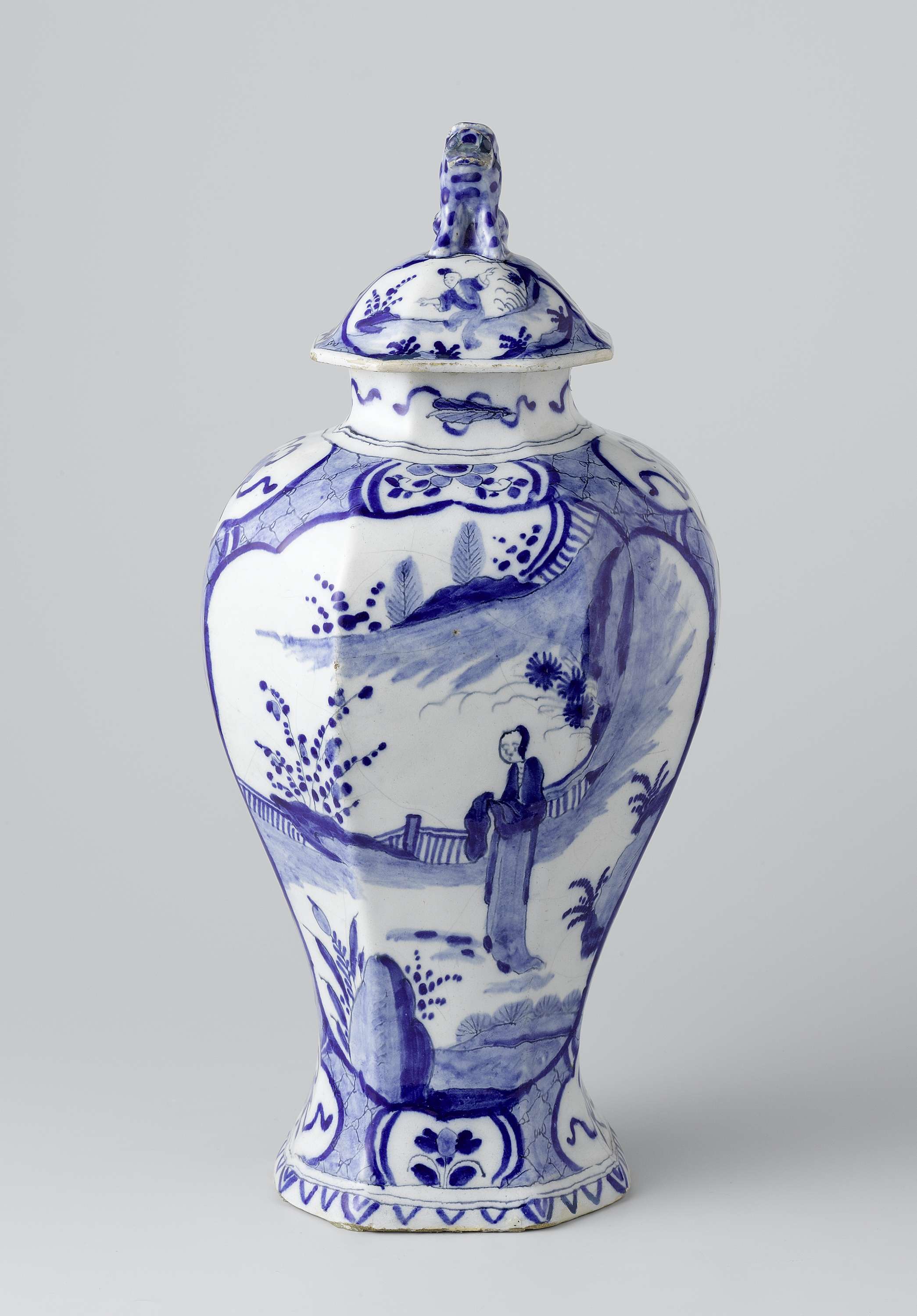 pot met een deksel van faïence, achtkantig en in blauw beschilderd. De knop van het deksel is een zittende leeuw. Op de pot zijn twee medaillons geschilderd waarbinnen een landschap met een Chinese figuur. De pot is onderdeel van een stel, de andere delen zijn: drie identieke potten en een identieke vaas. De delen zijn gemerkt. (Nederlands)