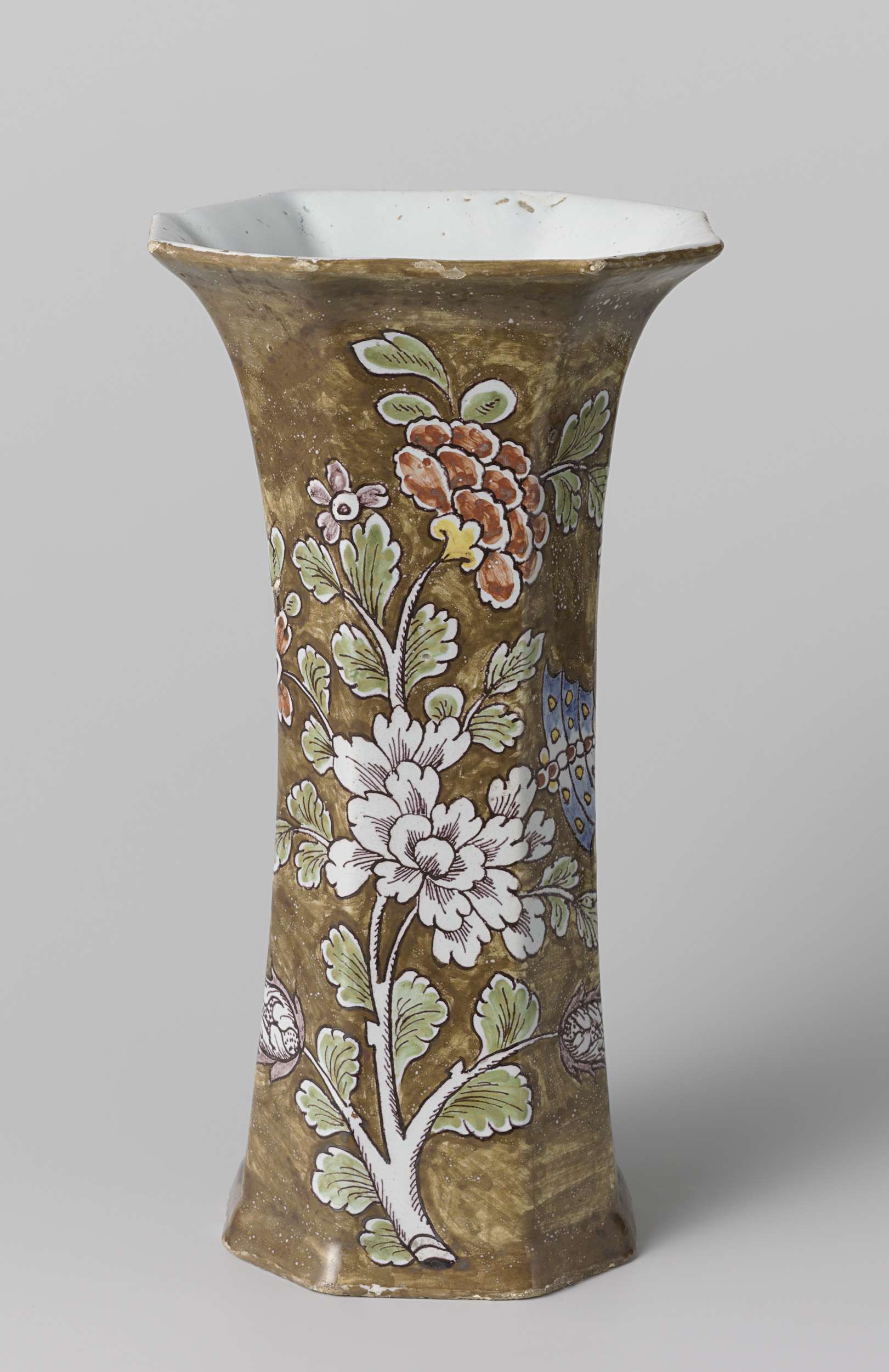 Vaas van veelkleurig beschilderde faience, met een bruine fond. De vaas is concaaf cilindrisch. Op de vaas zijn bloemtakken geschilderd in de kleuren wit, groen, geel, rood, blauw en paars. De vaas is onderdeel van een stel. De andere delen zijn een identieke vaas (BK-NM-13329-b) en twee identieke pullen (BK-NM-13329-a en BK-NM-13329-c). De delen zijn gemerkt. (Nederlands)