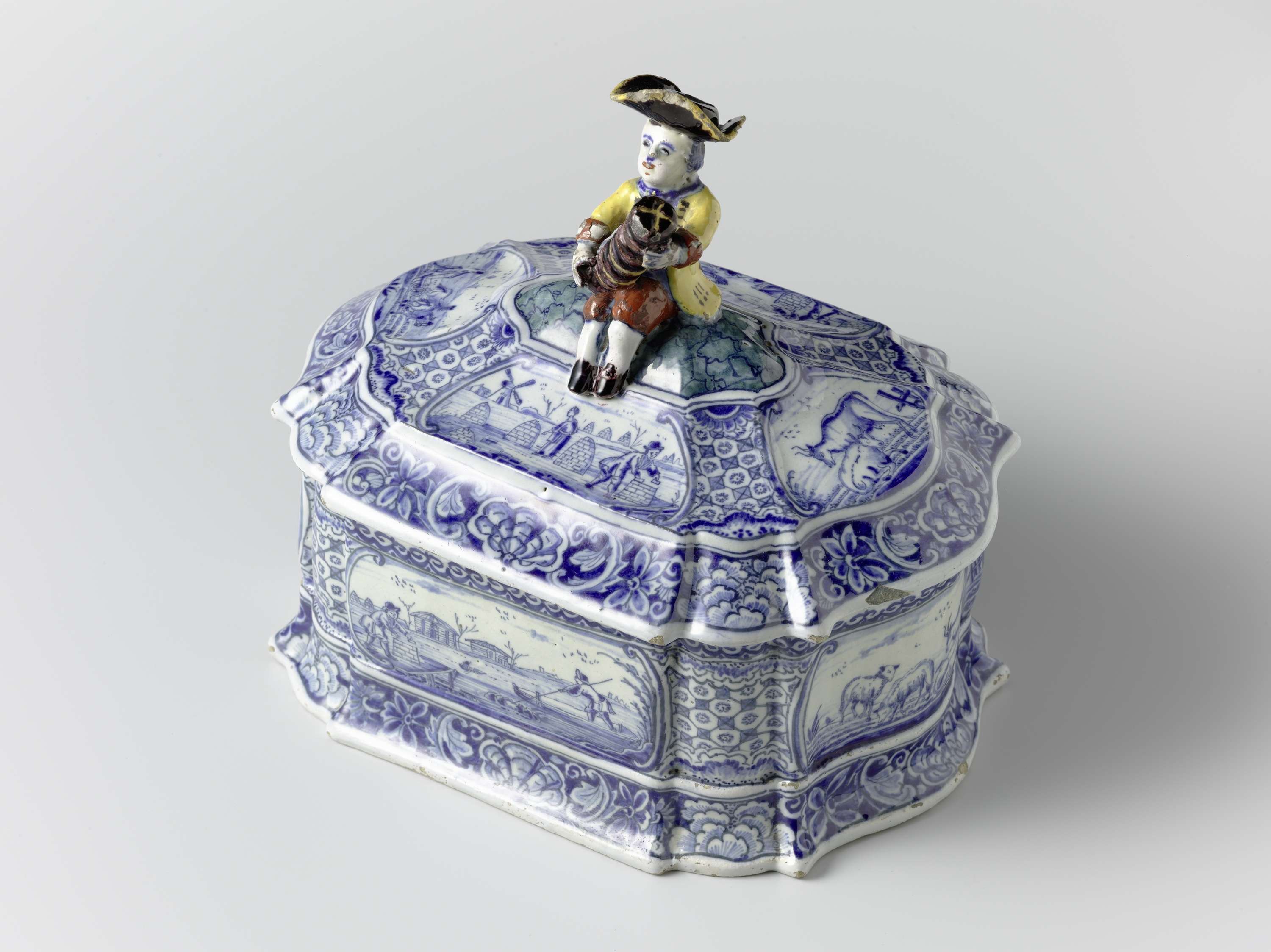 Tabakspot met deksel en tussendeksel van faïence, Langwerpig met uitgeschulpte hoeken, in blauw beschilderd met medaillons met landschappen en bloemenrand. Het deksel heeft een veelkleurige zittende figuur als knop (Nederlands)