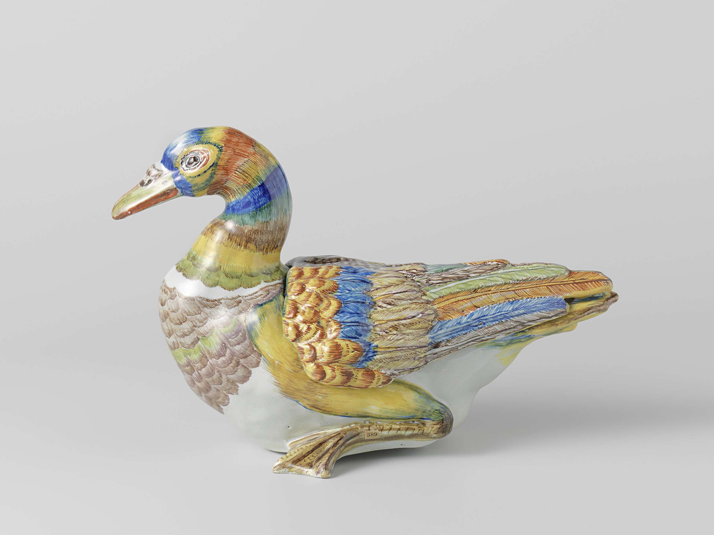 Terrine van faïence, in de vorm van een eend. Veelkleurig beschilderd. (Nederlands)