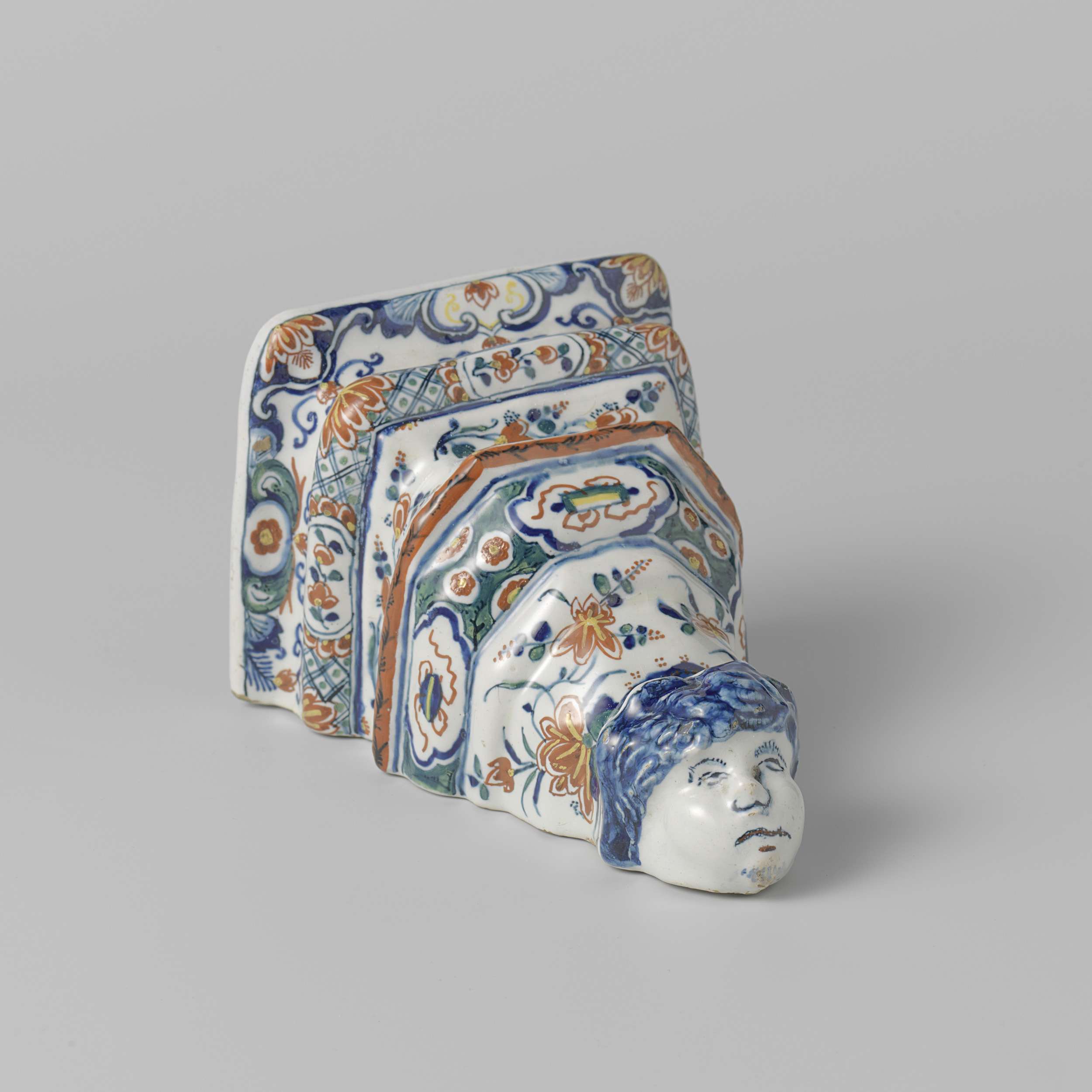 Console van faïence. Veelkleurig beschilderd en aan de onderzijde een mensenhoofd. (Nederlands)