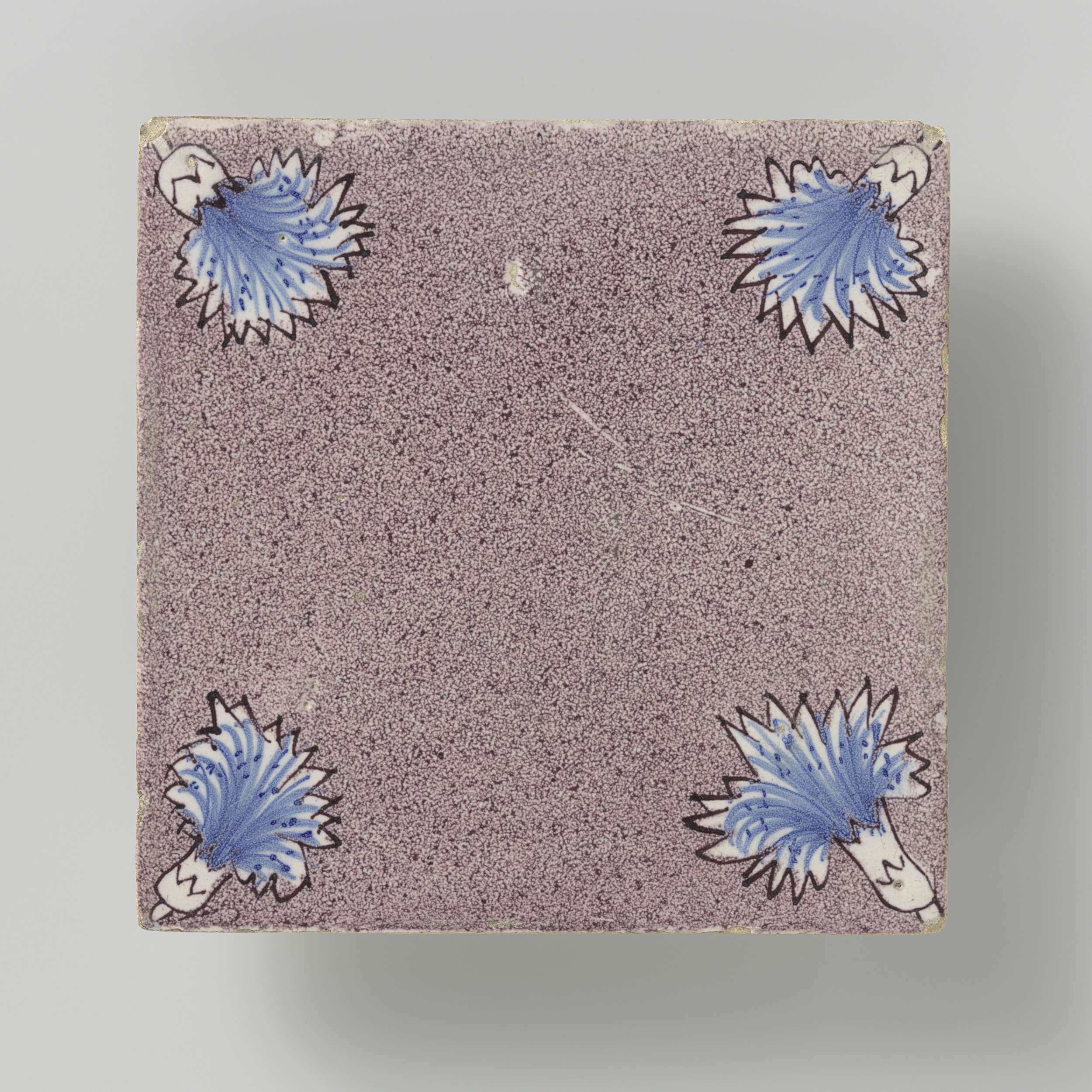 Tegel met een paars gesprenkeld fond en blauw geschilderde anjers in de hoeken. (Nederlands)