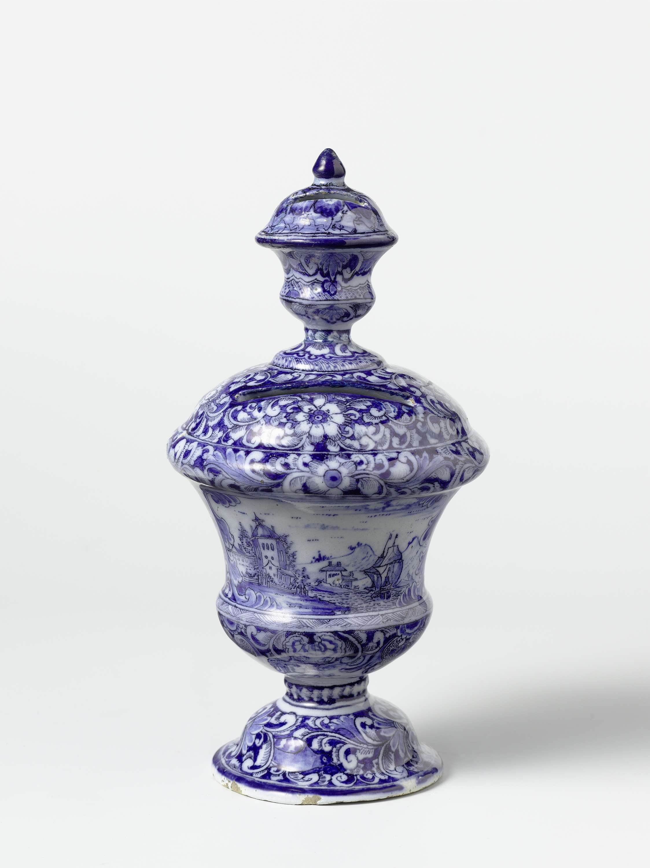 Spaarpot op voet van faïence, in blauw beschilderd met twee landschappen tussen een bloemornament. (Nederlands)