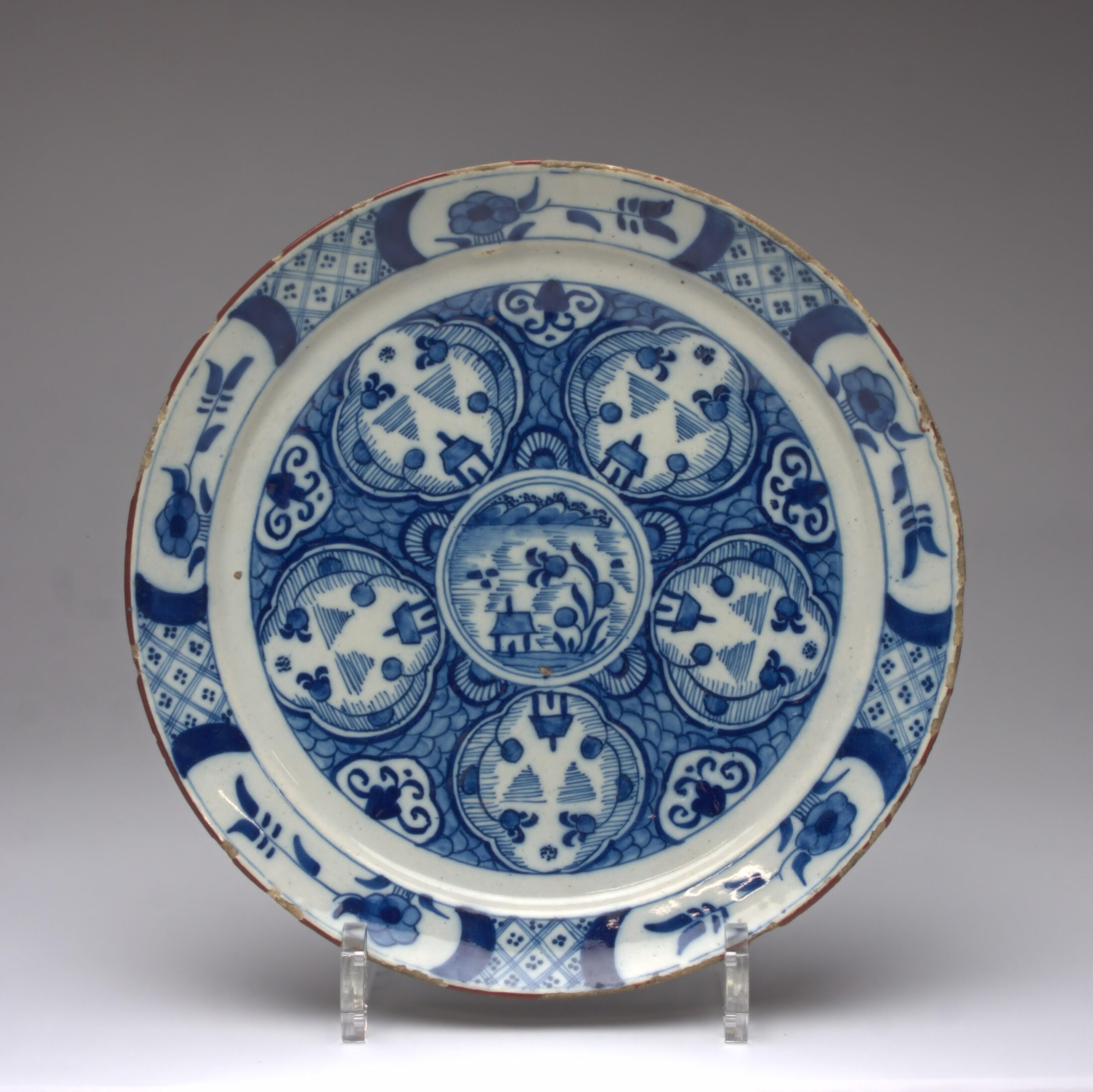 Bord met op het plat medaillons gevuld met decor van huis en bloemmotieven. Op de rand bloemmotief. Op achterzijde in inkt 'J.T. Dextra 1759 eigenaar van de fabriek de A grec' (Nederlands) | |||||||||||||||||||