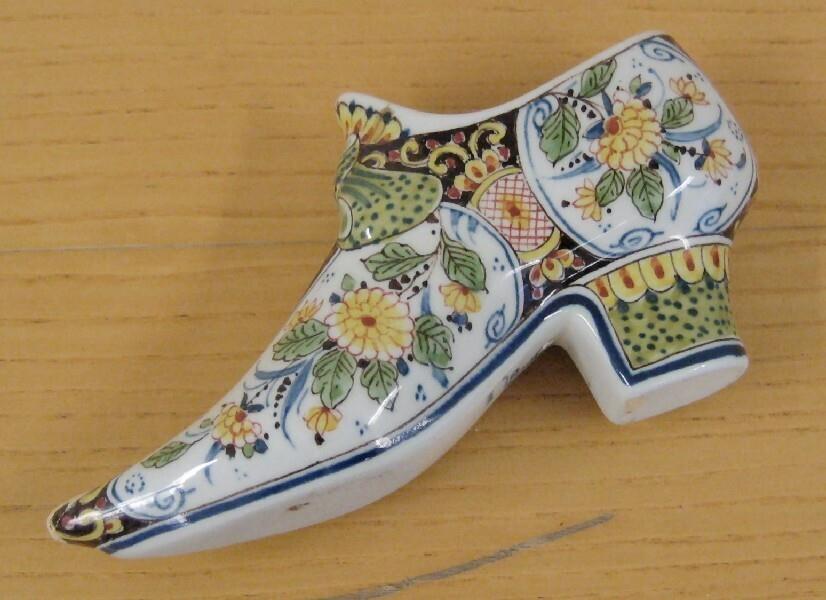 plastiek in de vorm van een schoen. De schoen is voorzien van een strik in relief, en gedecoreerd met aan traditioneel aardewerk ontleend bloem- en bladwerk in cartouches. (Nederlands) | |||||||||||||||||||