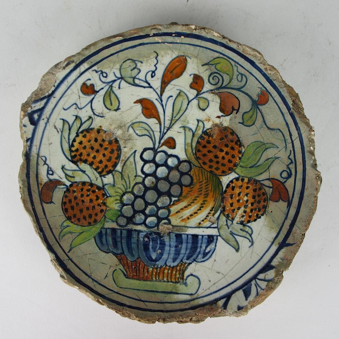 Fragment van bord met het plat versierd met fruitschaal met aardbeien en druiventrossen. (Nederlands) | |||||||||||||||||||