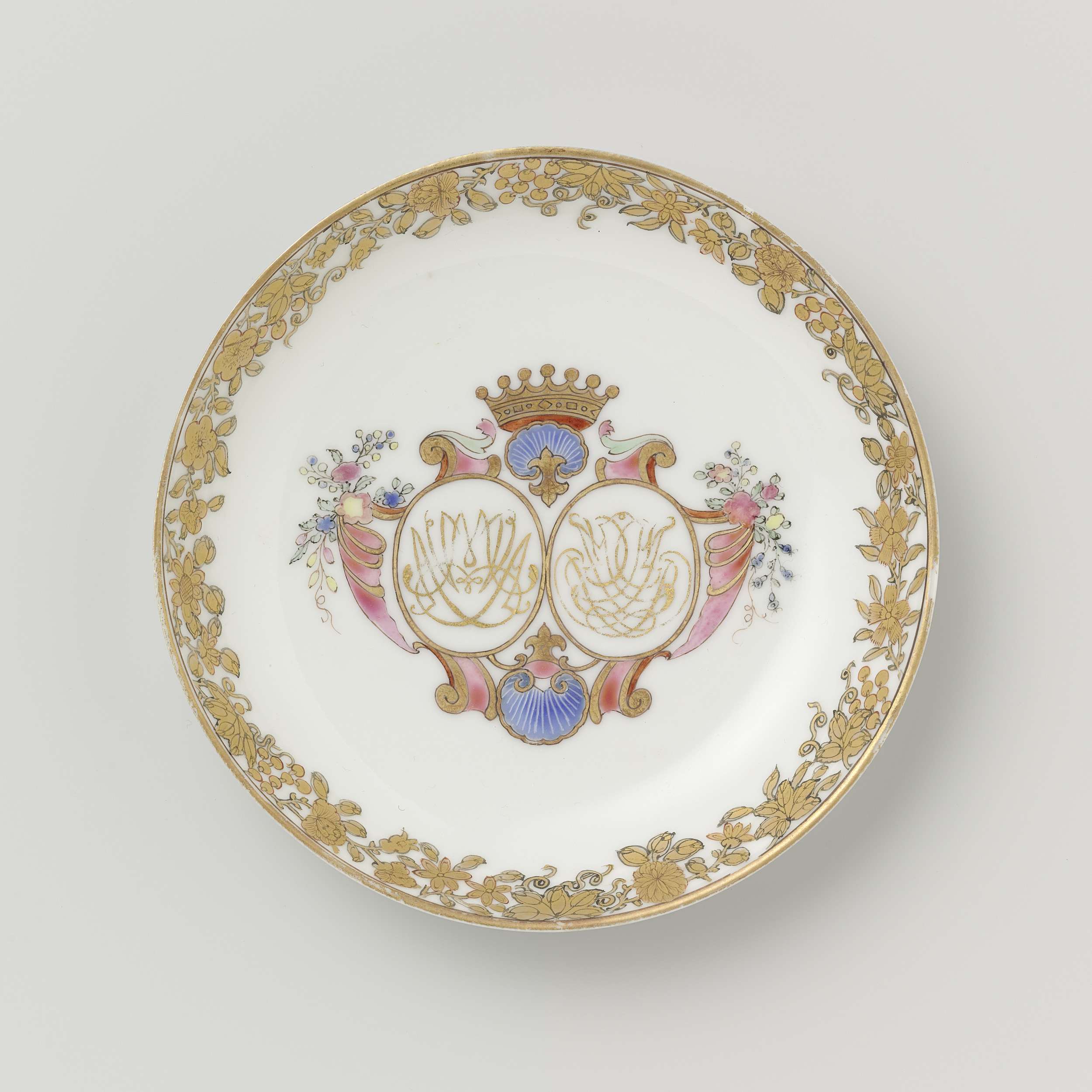 Saucer from the 'Swellengrebel service' with a double crowned monogram and a border with floral scrolls (Engels)
