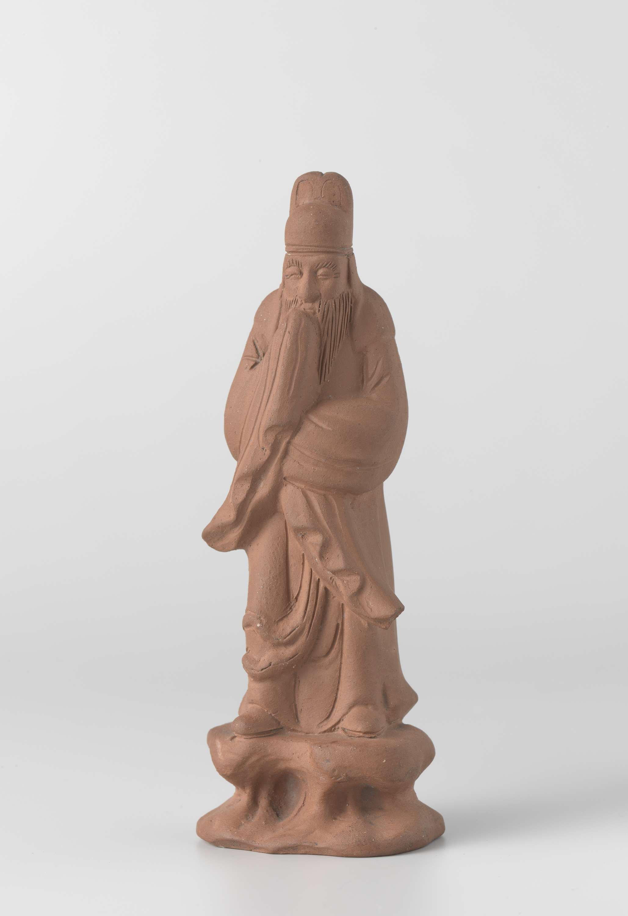 Figuur van roodbakkend aardewerk, voorstellende een op een rotsachtig voetstuk staande man. De man heeft een lange baard en draagt een tot aan zijn schoenen reikend gewaad. Hij houdt zijn rechterhand voor zijn mond. Het beeld is een voorbeeld voor het beeld met invnr. BK-1975-90. (Nederlands)