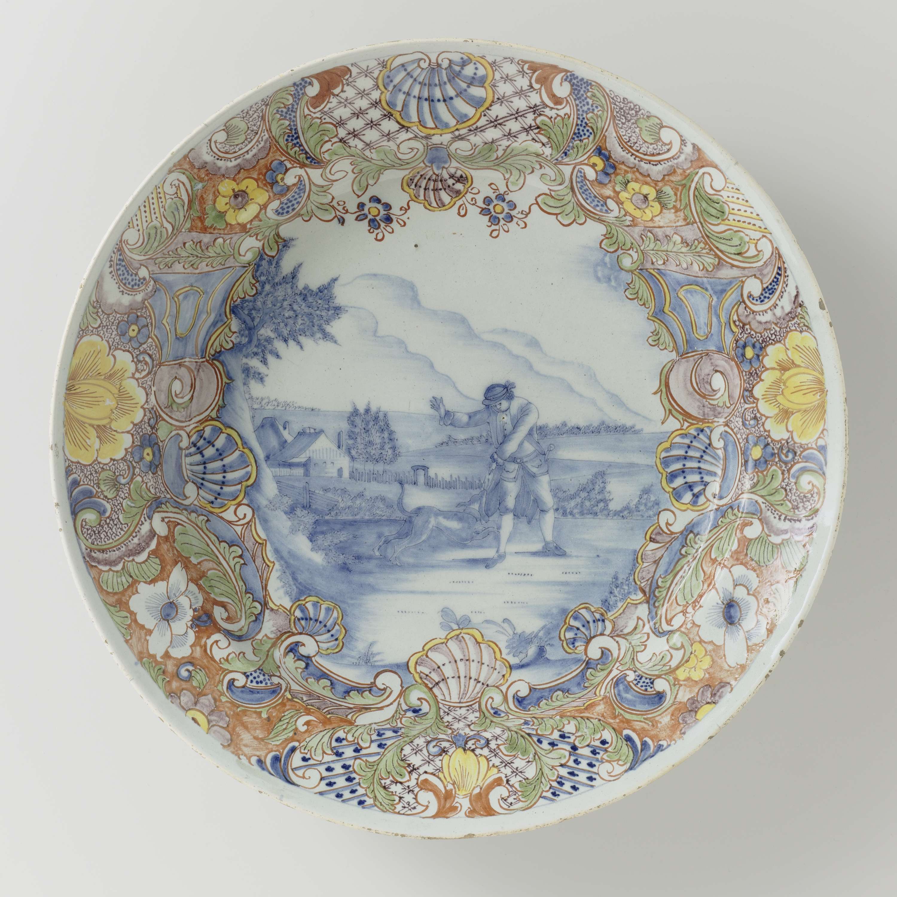 Schotel van faïence. Blauw beschilderd met een landschap. De brede rand is veelkleurig beschilderd.||Delft||http://hdl.handle.net/10934/RM0001.COLLECT.15827 |