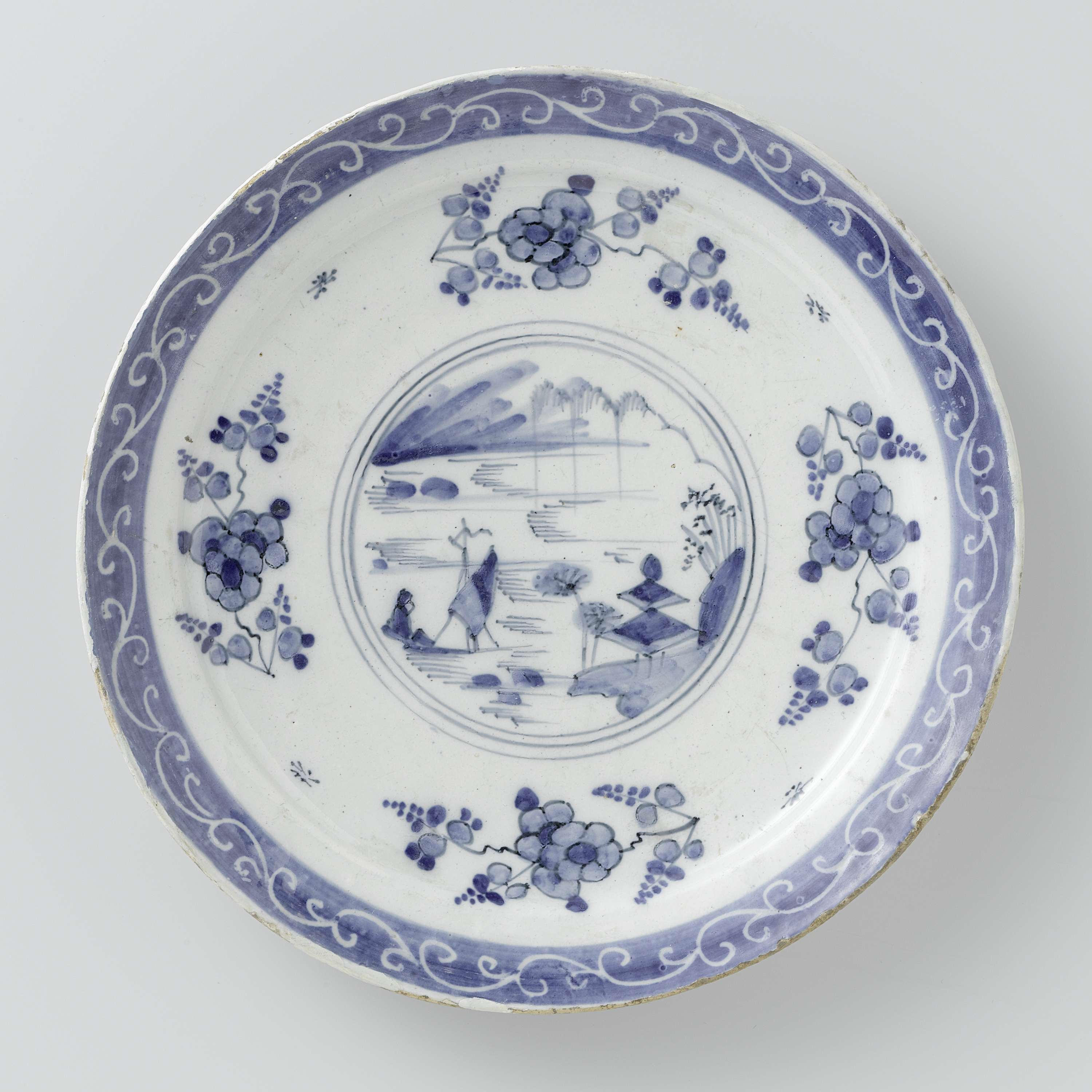 Bord van faience. Blauw beschilderd met een landschap met water. (Nederlands)