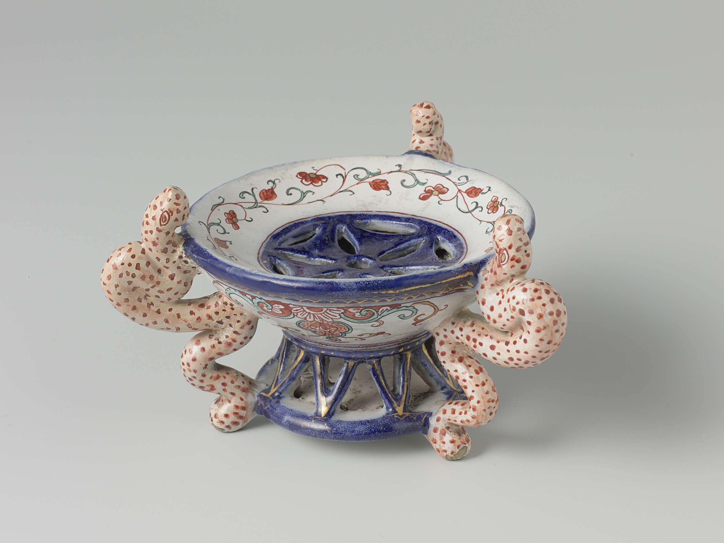 Parfumbrander van faïence. Veelkleurig beschilderd en met drie oren in de vorm van slangen (Nederlands)