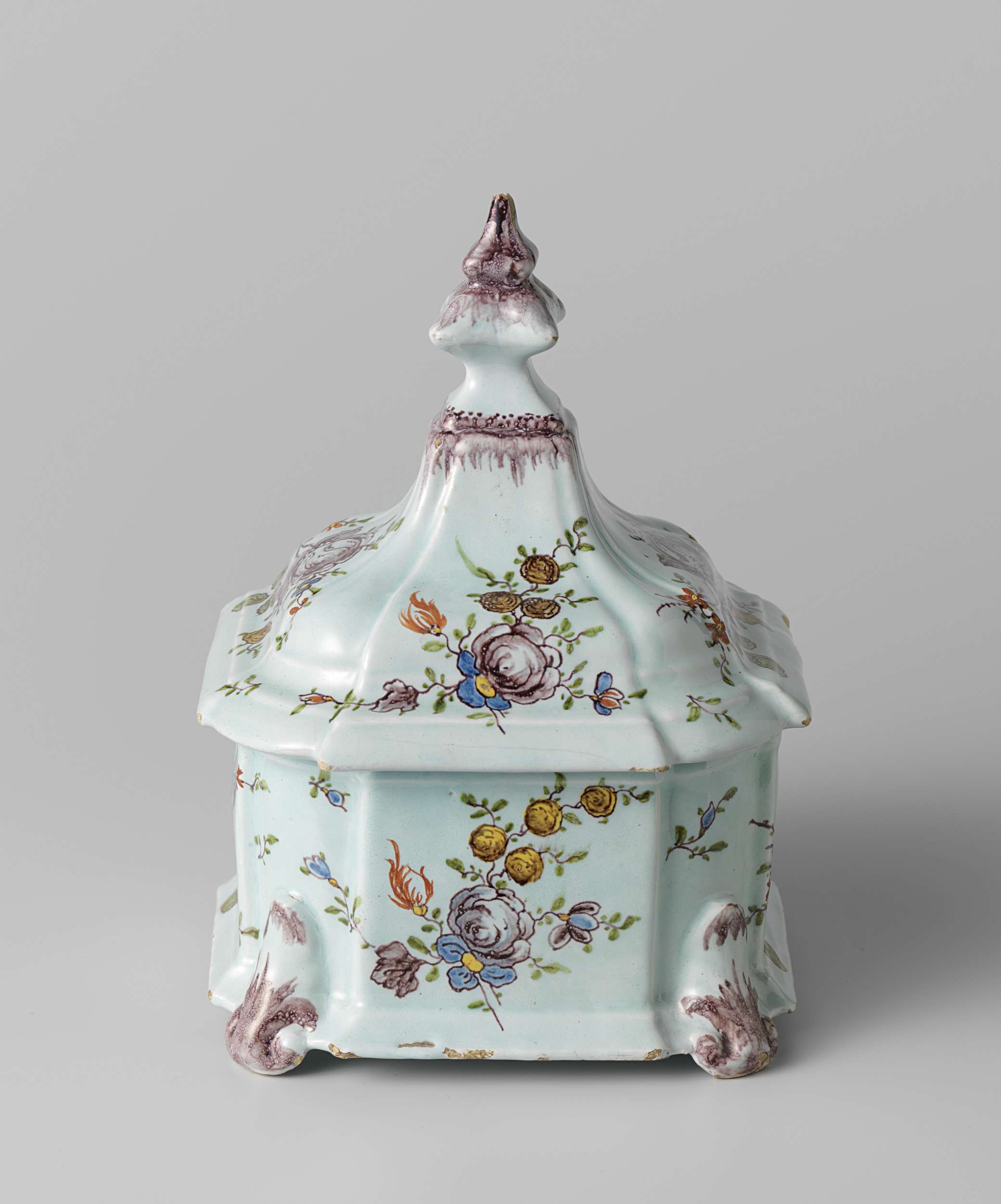 Tabakspot van veelkleurig beschilderde faience met decor van boeketten, met deksel en binnendeksel (Nederlands)