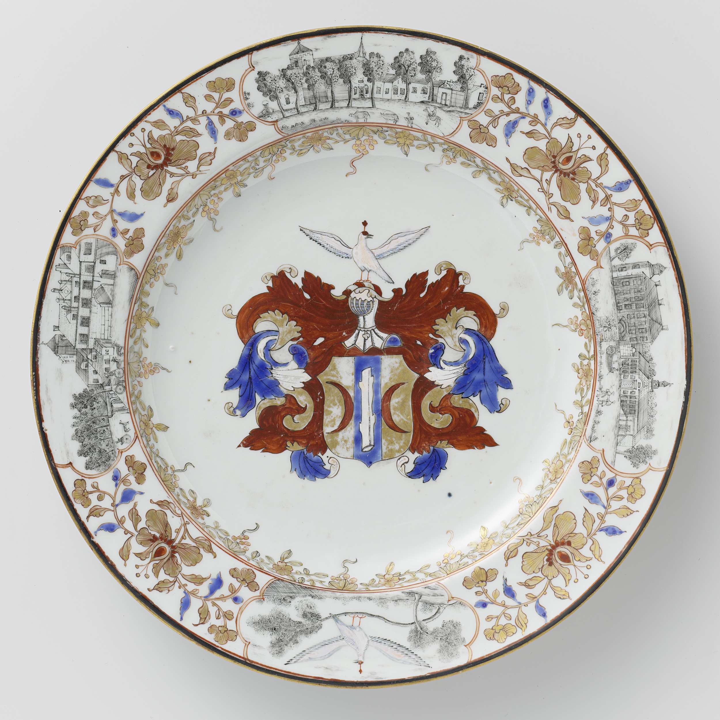 Schotel beschilderd in emails, encre de Chine en goud op het glazuur. In het plat het wapen van de familie Valckenier. Het wapen heeft in het midden een boomstronk met aan weerszijden halve manen en een helm met daarop de valk als helmteken. Het dekkleed is rood, blauw en goud. Op de wand een band met bloemranken in goud. Op de rand vier velden met stadsgezichten met daartussen lotusranken in goud en blauw. (Nederlands)
