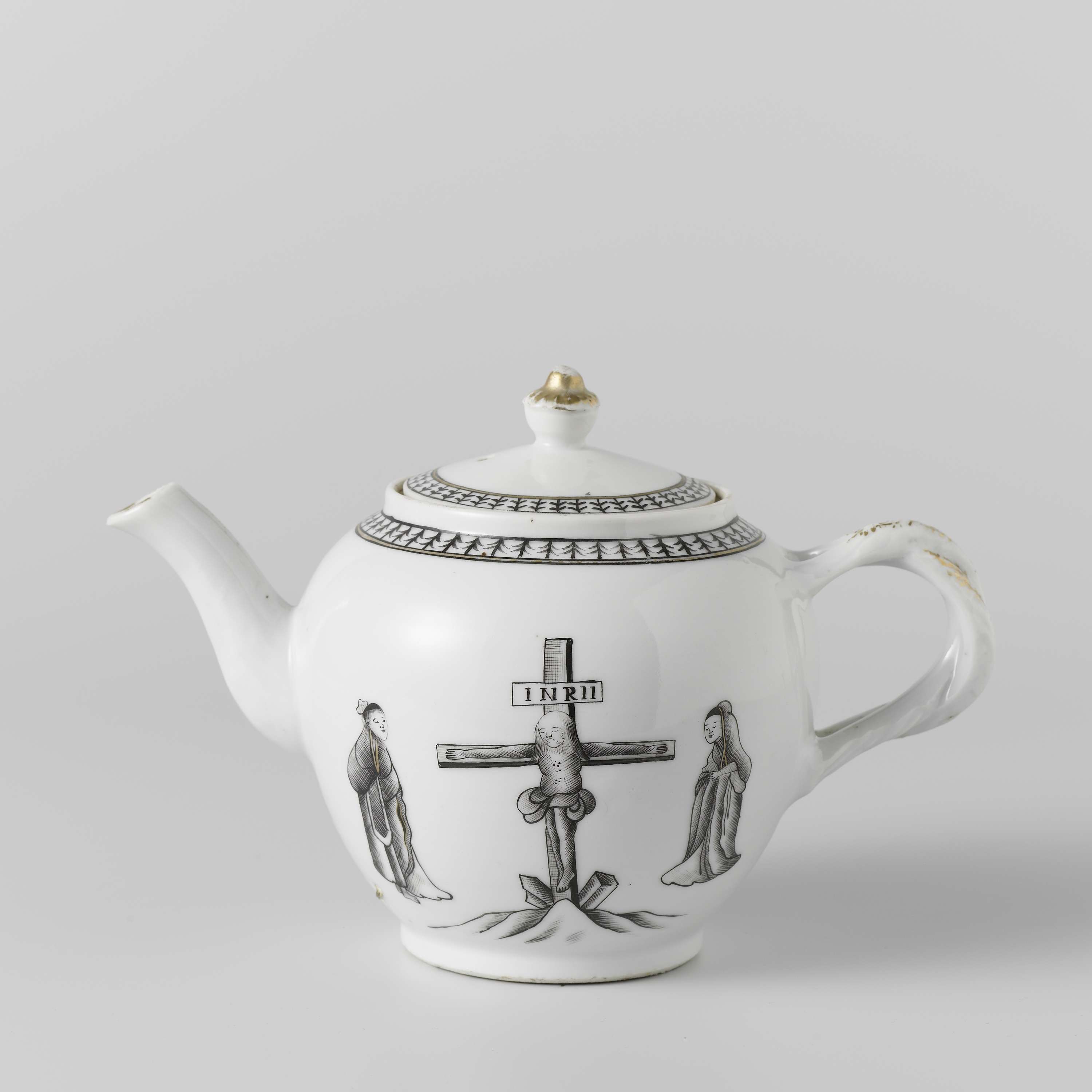 | Nederlands | Eivormige theepot met een voorstelling van de kruisiging |