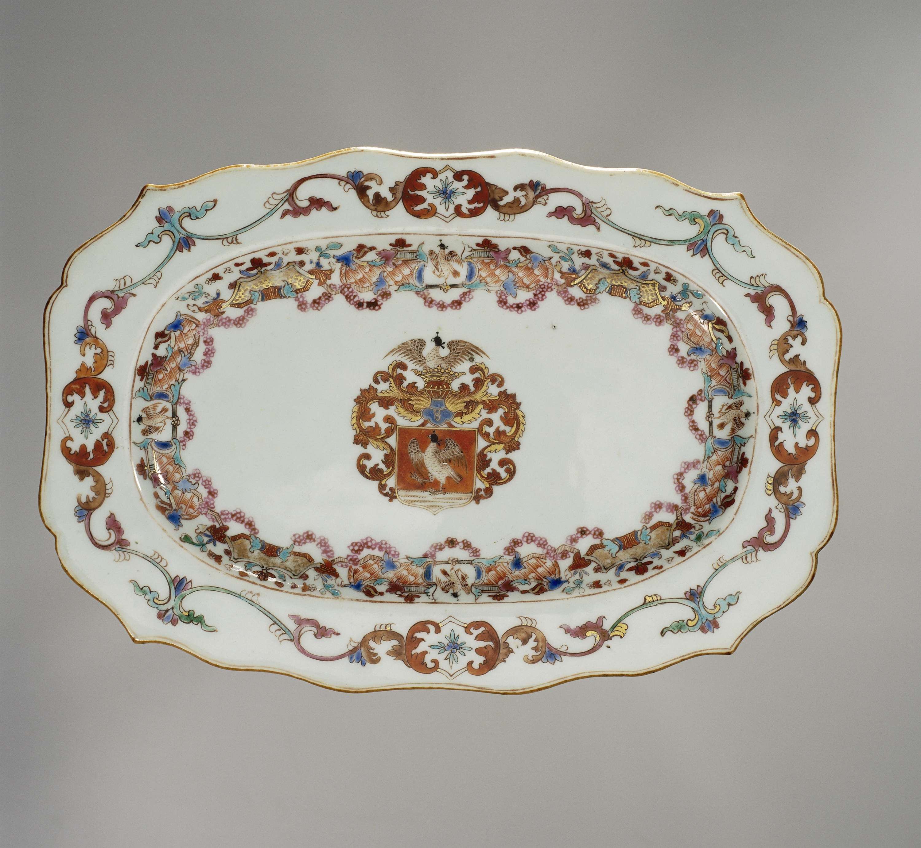 Langwerpige schotel van porselein met geschulpte rand, beschilderd op het glazuur met blauw, rood, roze, groen, bruin, zwart en goud. Op het plat het wapen van de familie Falck. Het wapen heeft een rode achtergrond met daarop een valk afgebeeld. Het helmteken is tevens een valk en het dekkleed bestaat uit bladranken in rood en goud. Op de wand een versiering in de Weense Du Paquier-stijl met cartouches, bloemen, guirlandes en valken. Op de rand een versiering van bloem- en bladranken. Een chip in de rand. Wapenporselein met emailkleuren. (Nederlands)