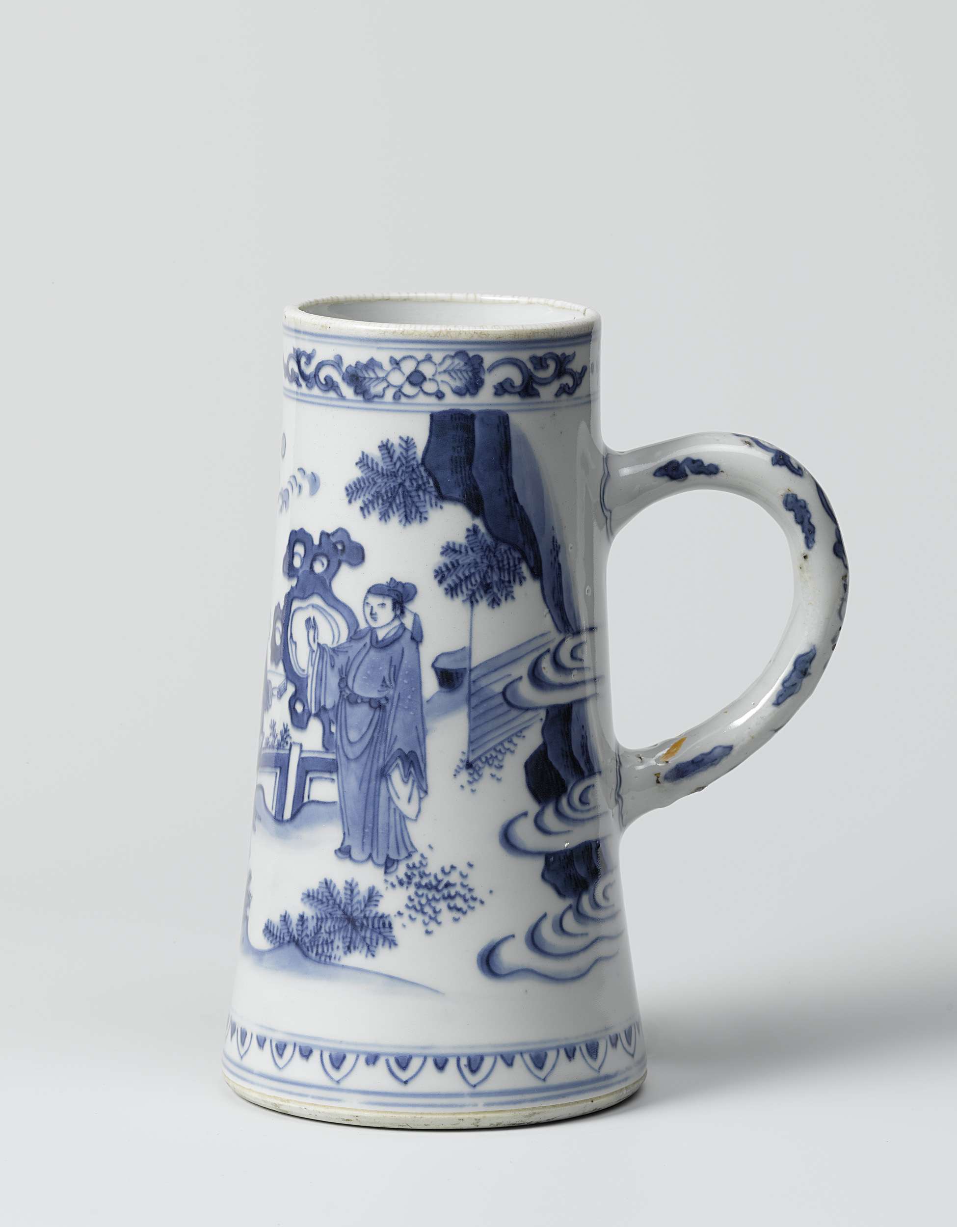 Conische bierpul van porselein met een C-vormig oor, beschilderd in onderglazuur blauw. Op de wand een omheinde tuin met rotsen, bananenplant, planten en wolken met daarin een geleerde die een aangeboden geschenk weigert. Boven de voet een band met afhangende bladmotieven. Op de rand een band met bloemranken. Het oor met een bloemrank en wolkmotieven. Overgangsporselein in blauw-wit. (Nederlands)