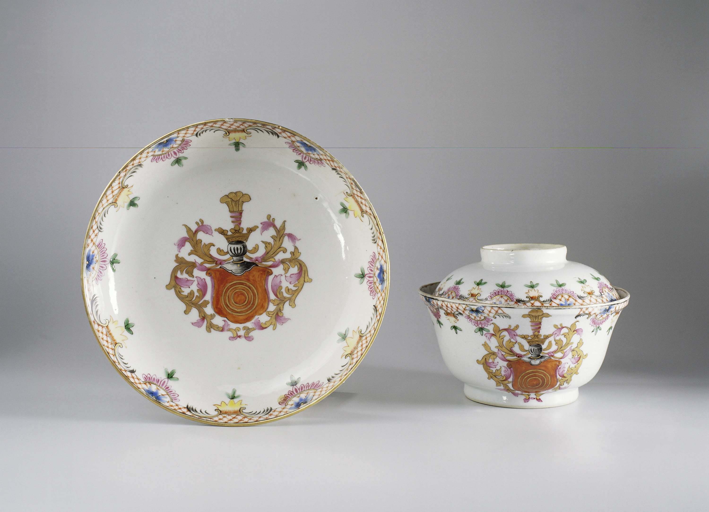 | Nederlands | Suikerpot met deksel en schotel met het wapen van de familie Romswinckel |