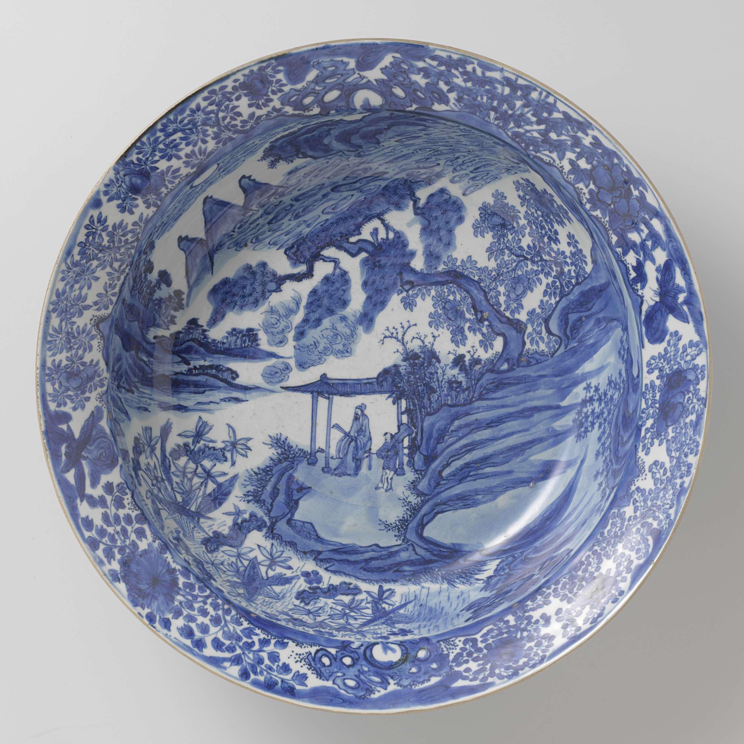 Ondiepe, wijde kom van porselein, beschilderd in ondeglazuur blauw. Op de bodem een landschap met bergen, bomen (pijnboom, pioen) en bloeiende planten (lotus) met daarin een geleerde onder een afdak met naast hem zijn bediende met een waaier. Op de rand een band met bloeiende planten (chrysant, pioen) en vlinders bij een rots. Op de buitenwand vlinders tussen bloemtakken. De buitenrand met drieklauwige parelnajagende draken tussen vlammen. Gemerkt op de onderzijde met het zes-karaktermerk van keizer Chenghua in een dubbele cirkel. Overgangsporselein in blauw-wit. (Nederlands)