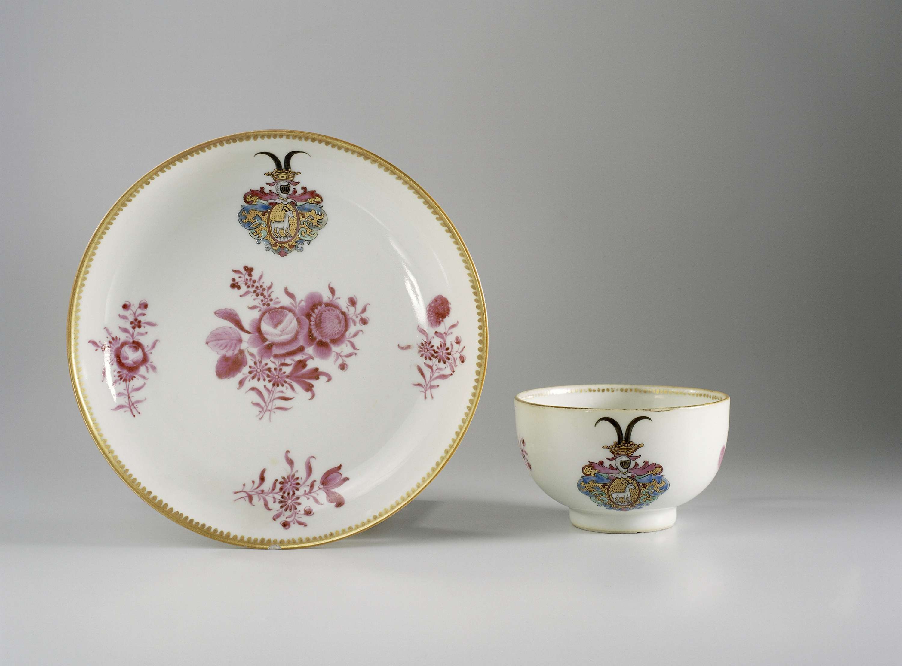 Oorkop en schotel van porselein, beschilderd op het glazuur in blauw, rood, roze, groen, zwart en goud. Op het plat van de schotel een boeket met bloemen en drie bloemtakken (en camaïeu) en een ongeïdentificeerd familiewapen. Op het wapen een ram op een rots tegen een goud gespikkelde achtergrond. Het helmteken is een kroon met twee horens. Het dekkleed bestaat uit bladranken. Op de binnenrand een decoratieve band. De kop met dezelfde decoratie. Een chip in de rand van de schotel. Wapenporselein met emailkleuren. (Nederlands)