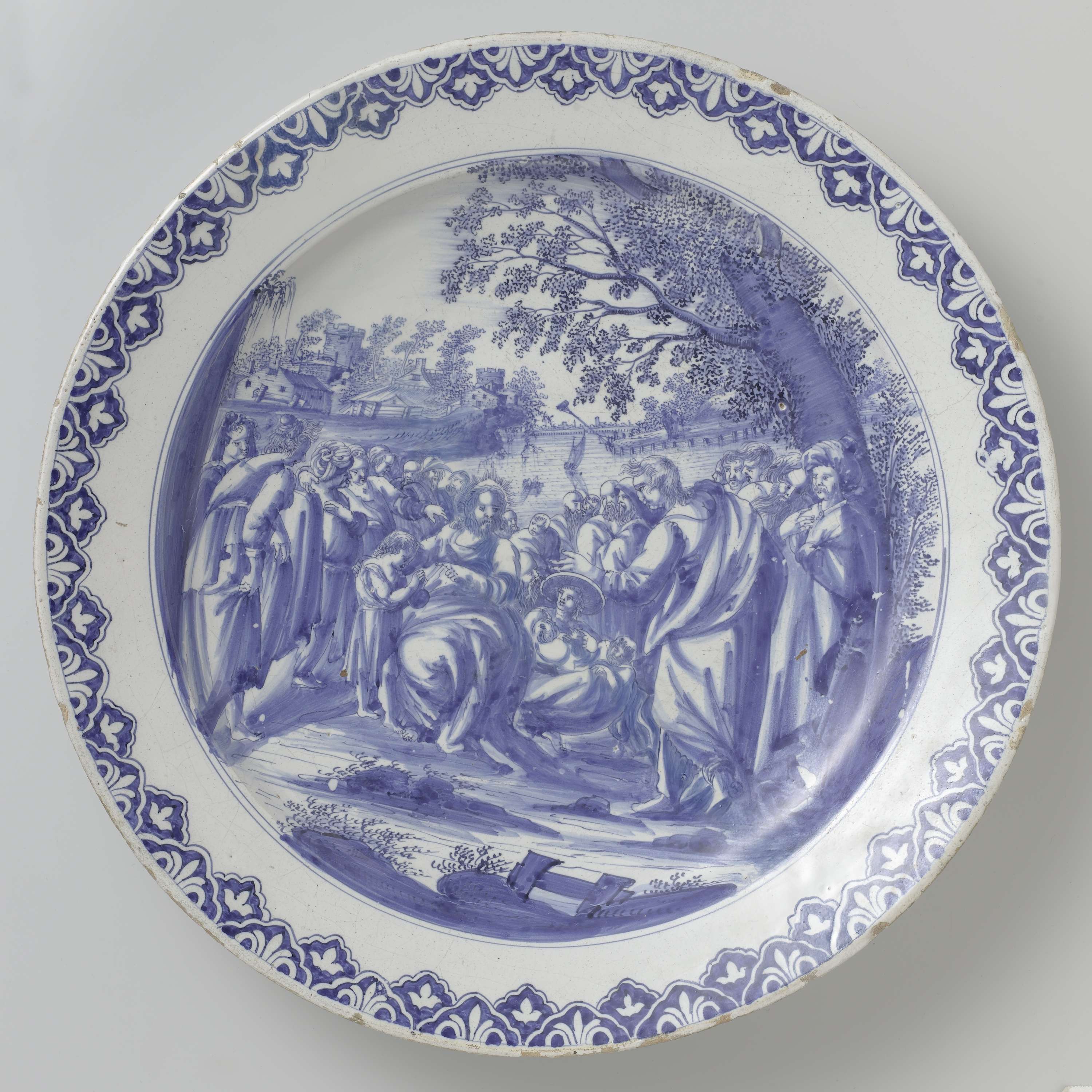 Schotel van faience met een voorstelling van Jezus die de kinderen tot zich laat komen (Nederlands)