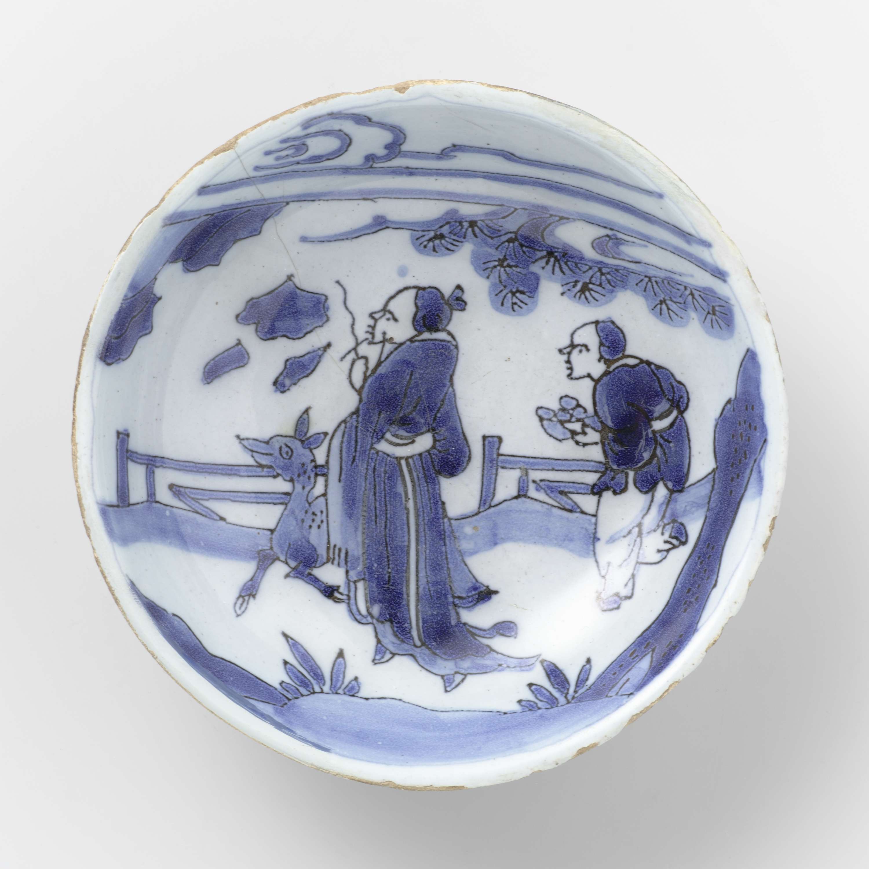 Rond bakje op lage voet van aardewerk met wit tinglazuur bedekt. Beschilderd in blauw met twee Chinezen en een hert in een tuin met hekjes. (Nederlands)