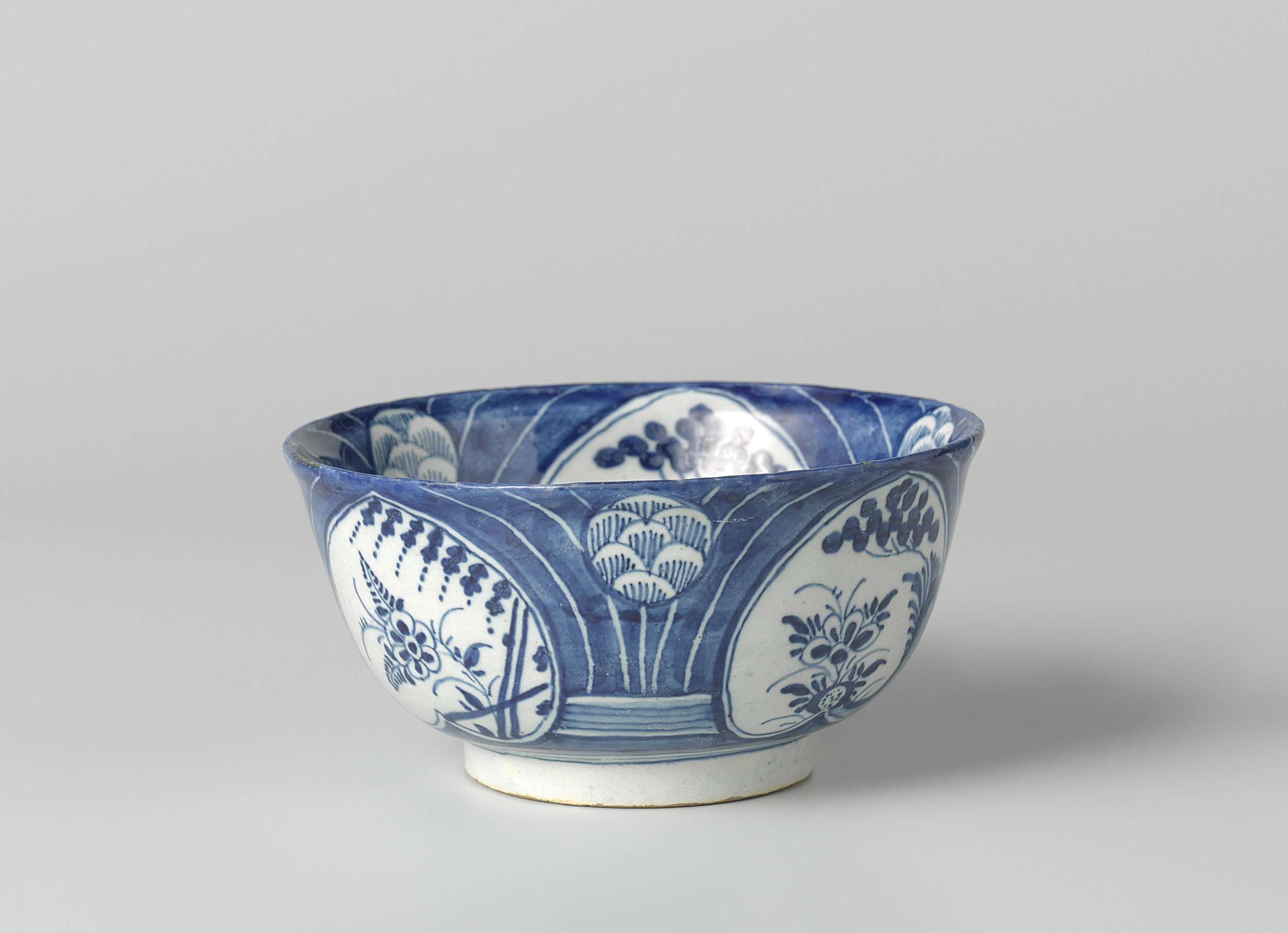 Kom van faience, blauw gedecoreerd. Aan de binnen- en buitenzijde respectievelijk met drie en vier zogenaamde hartmotieven versierd die gevuld zijn met bloemen en bladeren. (Nederlands)