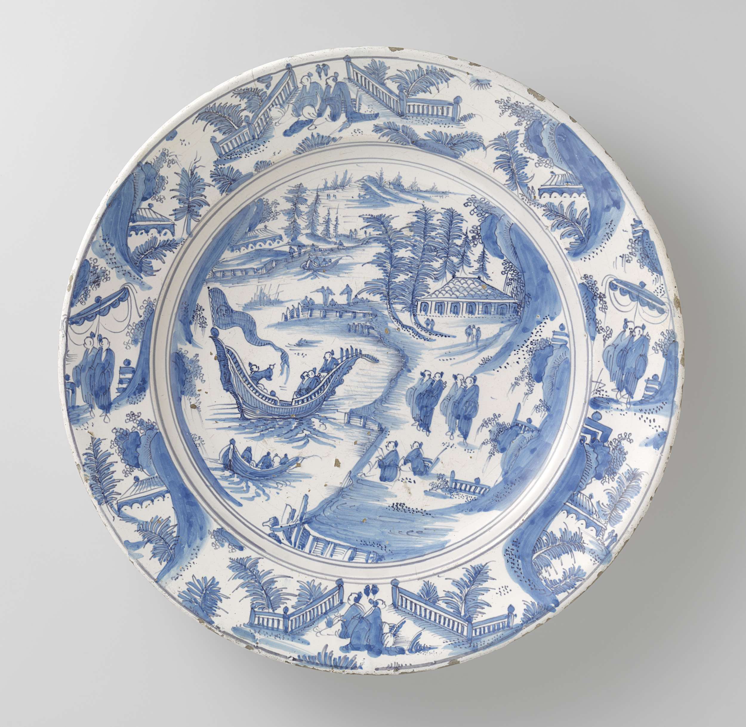 Schotel van faience met een decoratie geïnspireerd op het Chinese porselein uit de overgangsperiode. (Nederlands)