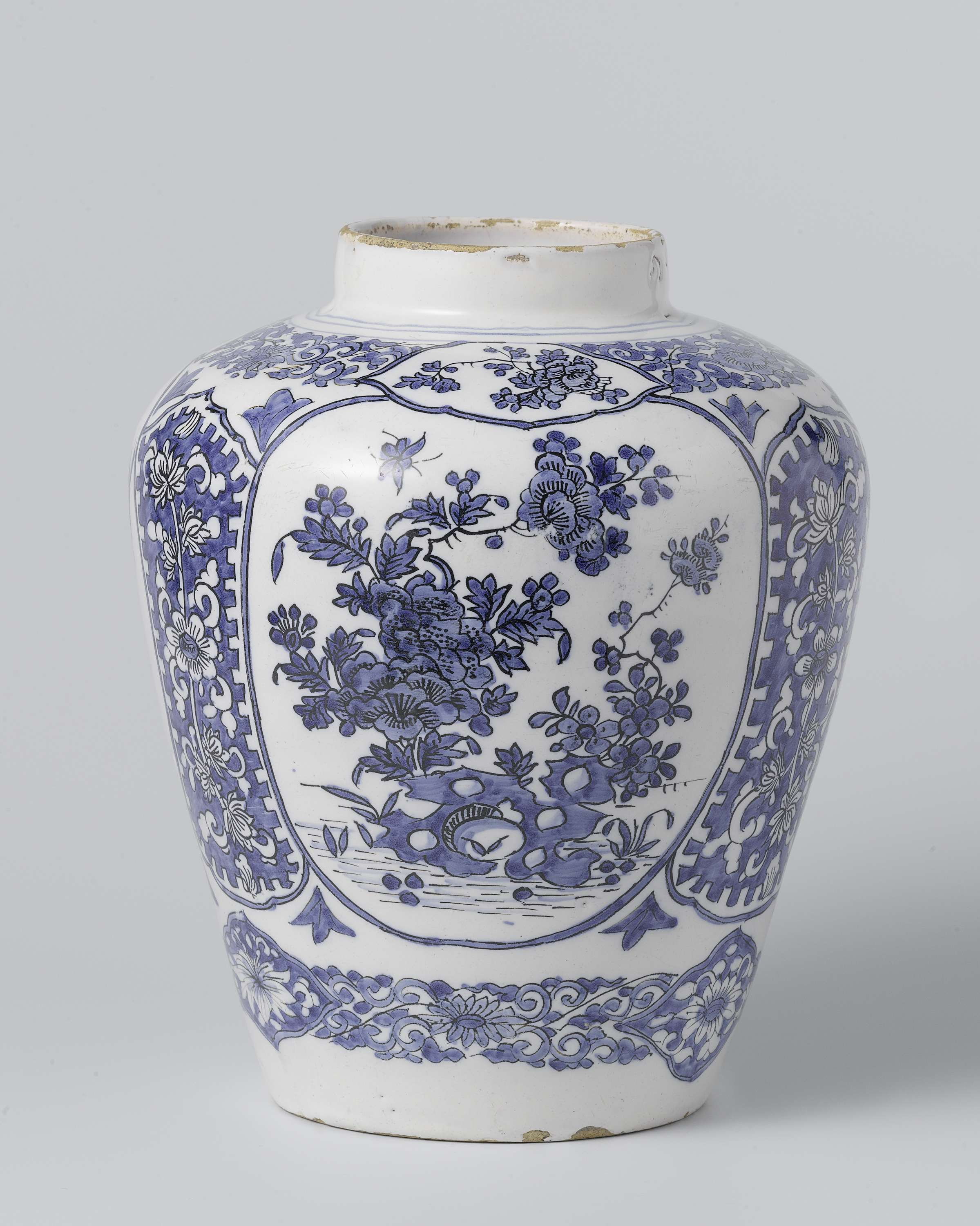 Pot (zonder deksel) van faience met een op het Chinese porselein geïnspireerde bloemendecoratie. (Nederlands)