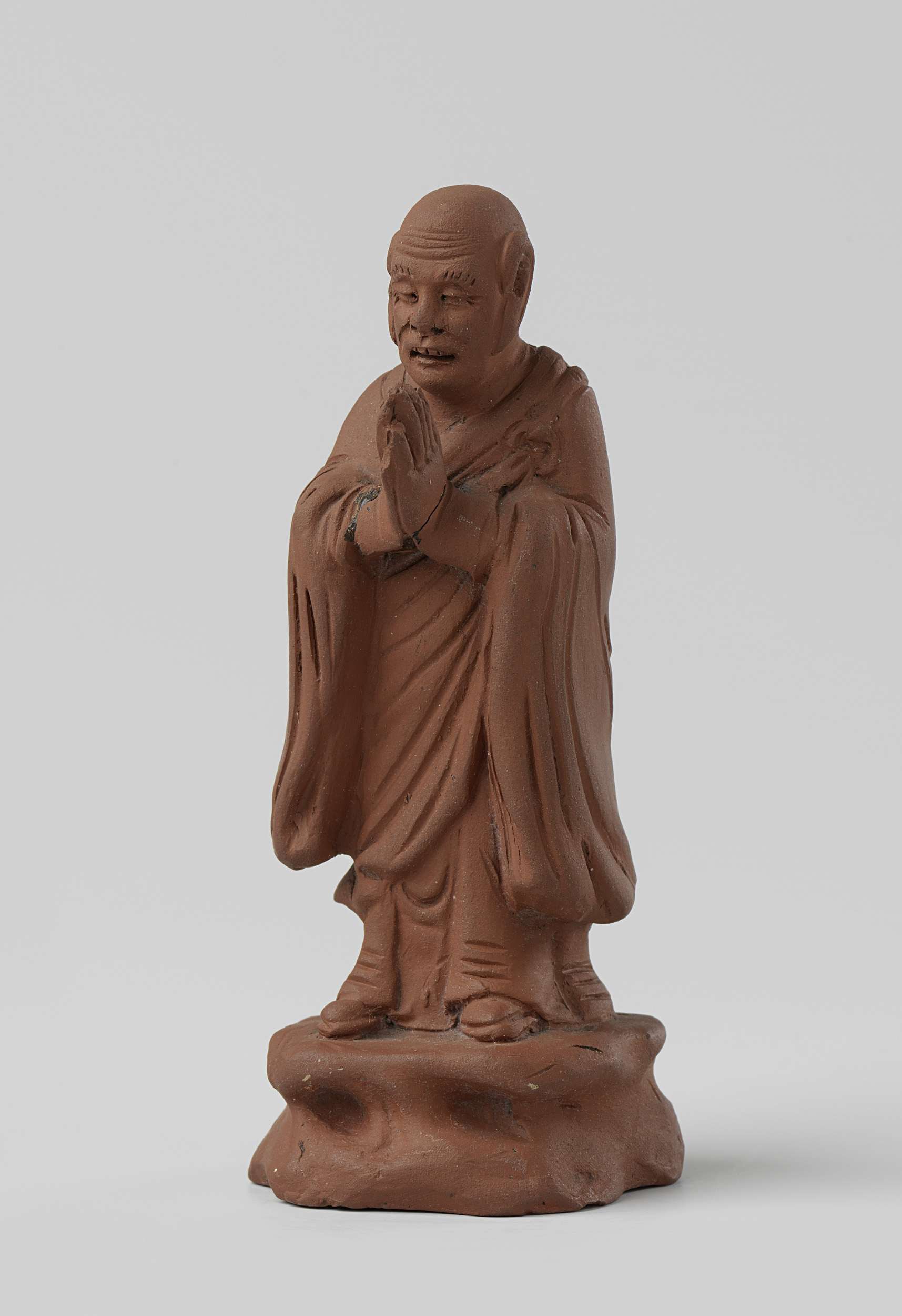 Beeld van roodbakkend aardewerk. Op een rotsachtig voetstuk staat een man. De man houdt zijn handen voor zijn borst tegen elkaar. (Nederlands)