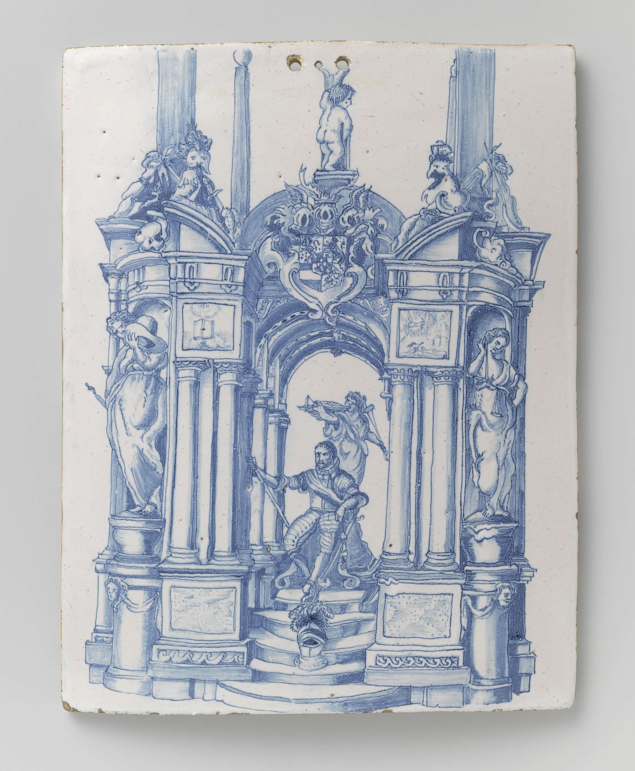 Plaat van faïence met het vooraanzicht van het graf van Willem van Oranje te Delft. (Nederlands)