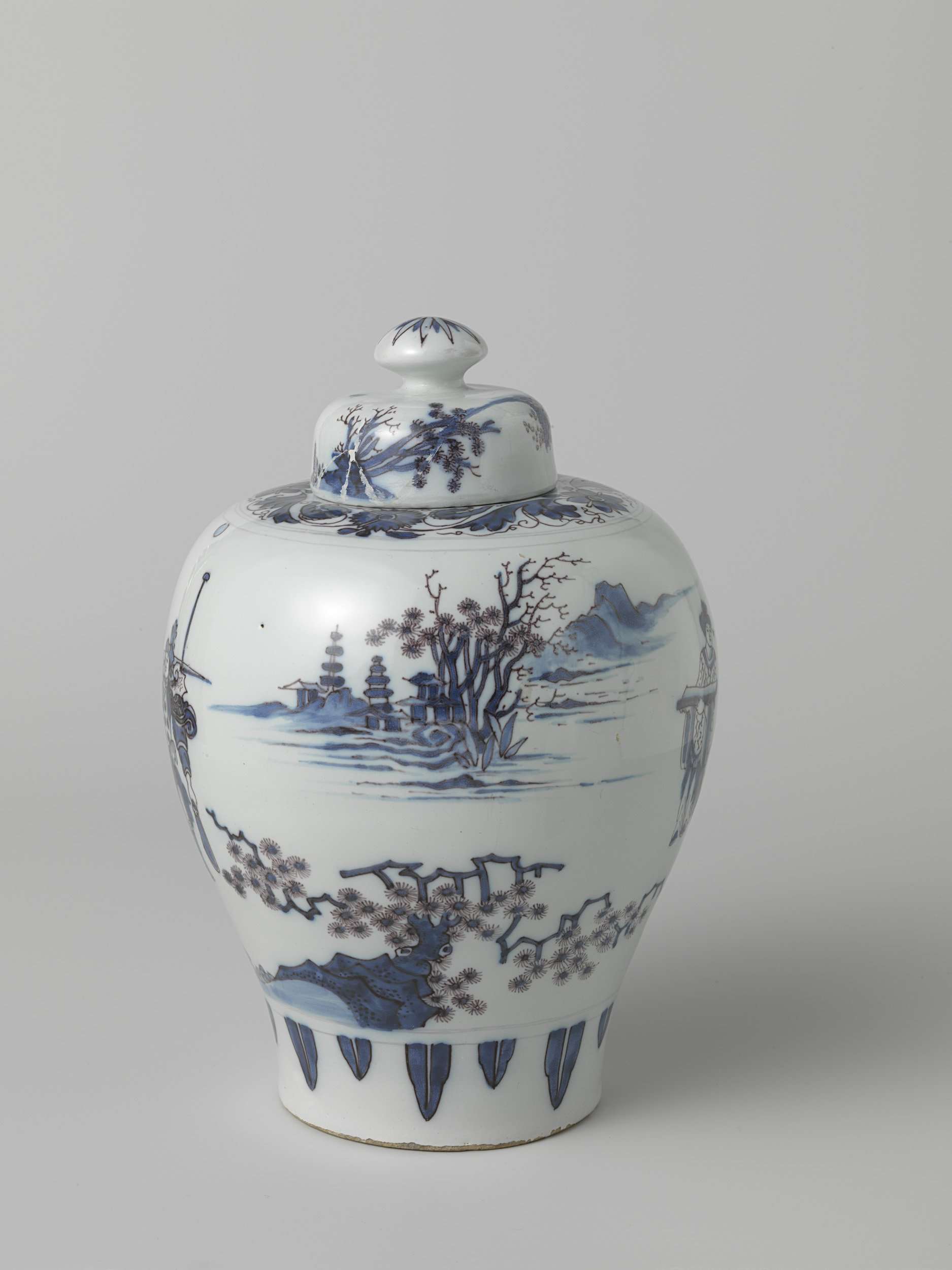 Pot met deksel van faience met een decoratie naar het chinese porselein in de overgangsperiode. De pot heeft een bijbehorende deksel. (Nederlands)